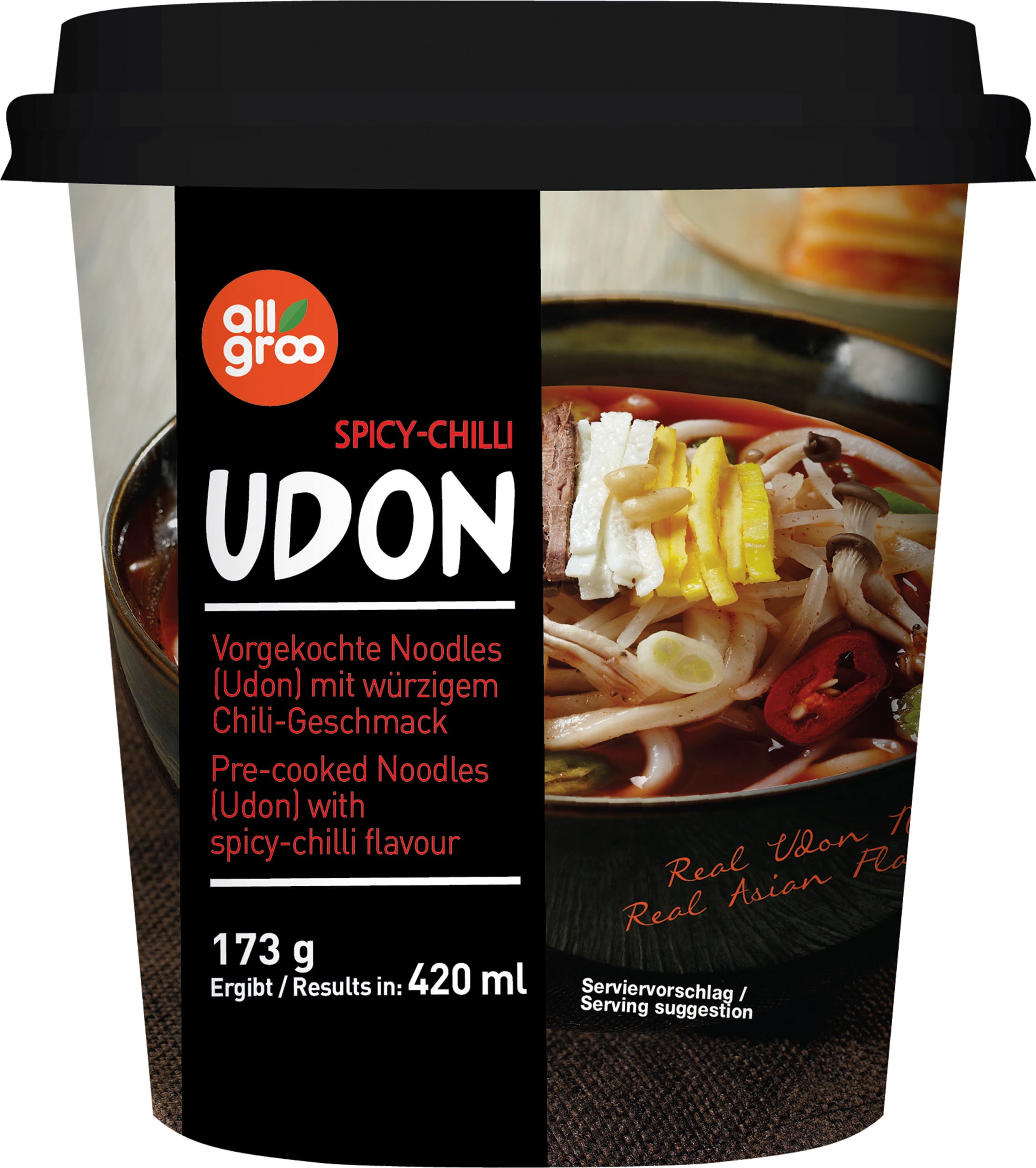 The udon cup noodles with chili flavour by allgroo are a great option for a quick and delicious meal at lunchtime. The cup contains pre-cooked udon instant noodles with a spicy chili flavour.