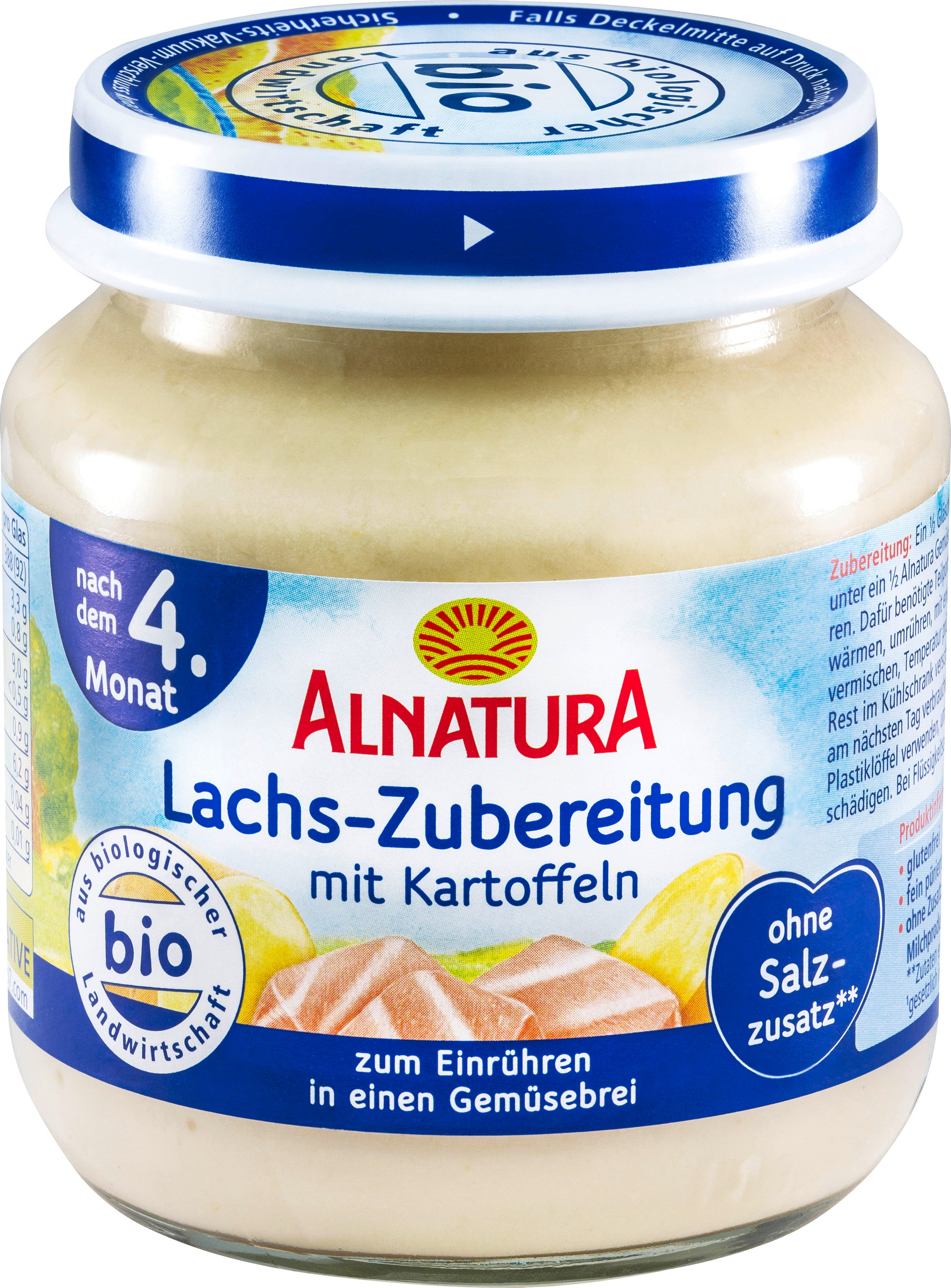 The gluten free baby jar Alnatura Organic Salmon with Potato is finely puréed. The potatoes are of Demeter quality, and the salmon comes from organic aquaculture. It is produced without added salt (ingredients contain naturally occurring salt) and is lactose free. Ideally, mix half a jar with half a jar of vegetable purée and warm gently in a water bath.