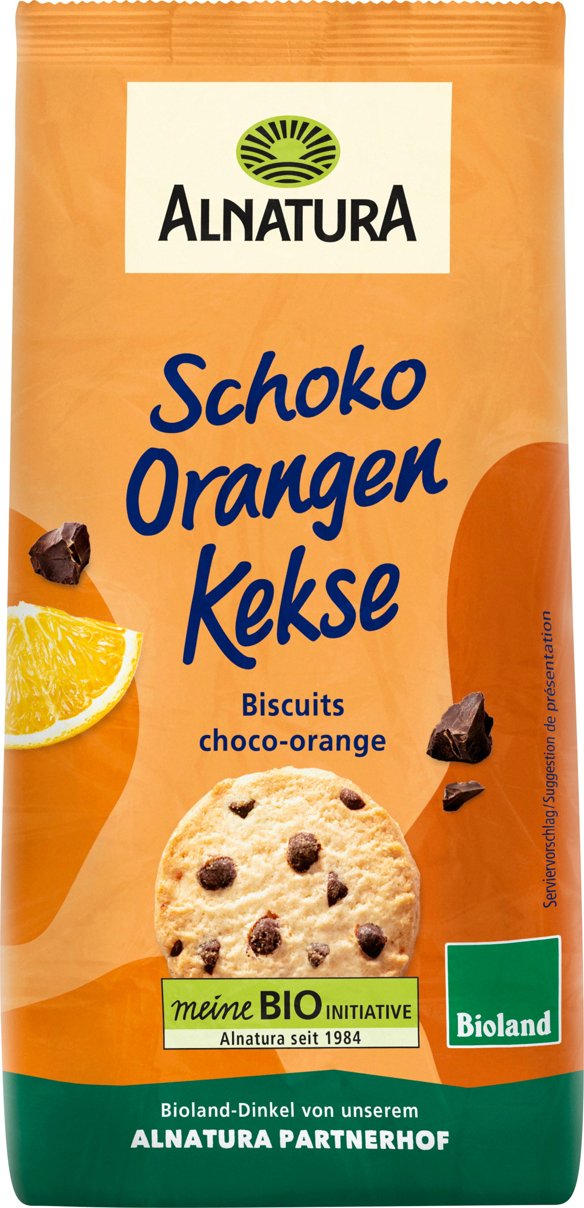 Alnatura Chocolate Orange Biscuits are made from spelt flour and refined with orange oil and pieces of dark chocolate. They pair perfectly with coffee and tea.
