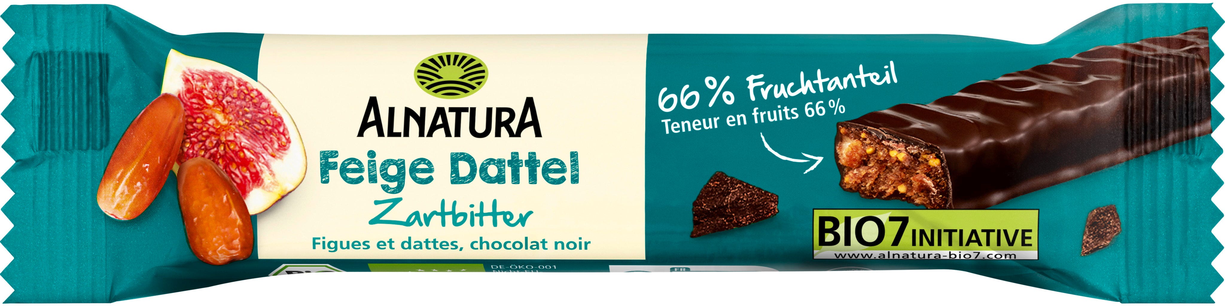 This Organic Fig Date Bar by Alnatura combines flavourful dried fruit with fine dark chocolate. Figs and dates are the main ingredients. The vegan bar contains no lecithins.