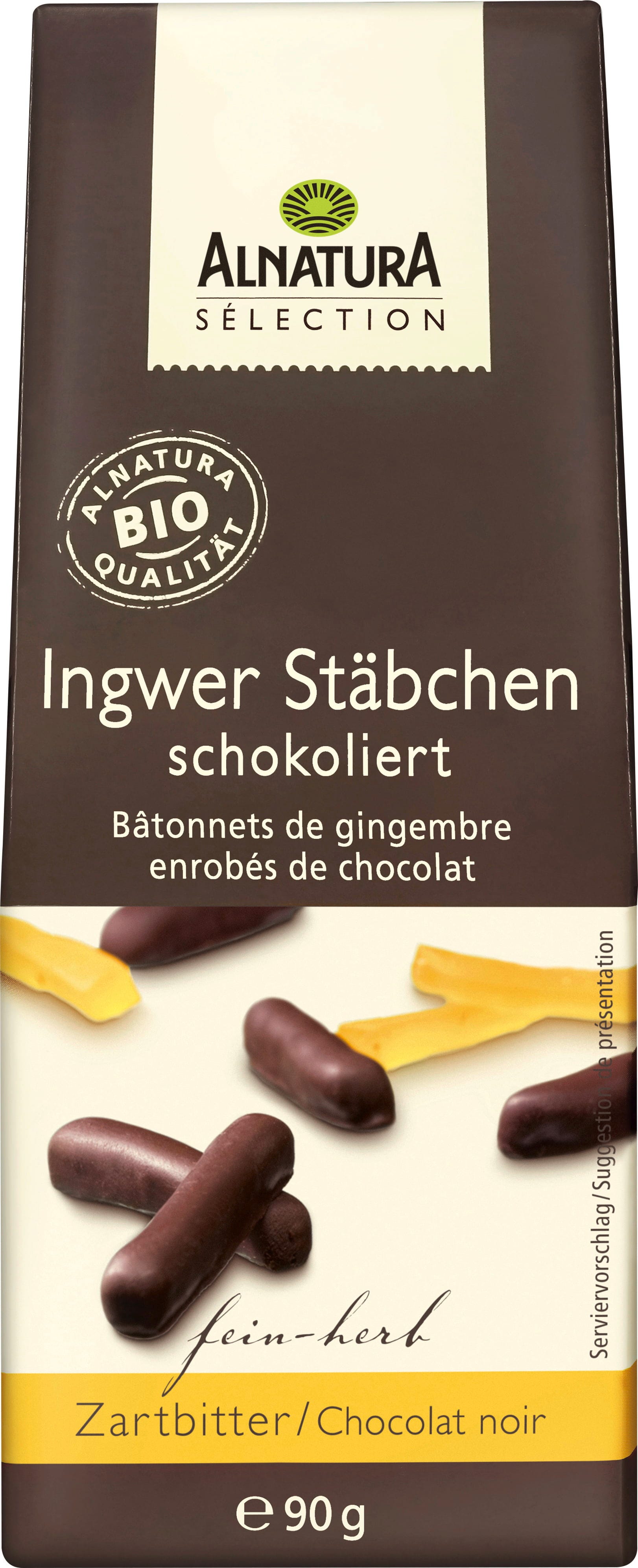 The Alnatura Organic Sélection Ginger Sticks combine candied ginger with a coating of delicately bitter dark chocolate. The aromatic heat of the ginger meets smooth melting chocolate, creating a distinctive flavour. These chocolate coated sticks pair well with tea or coffee and are also ideal for sharing.