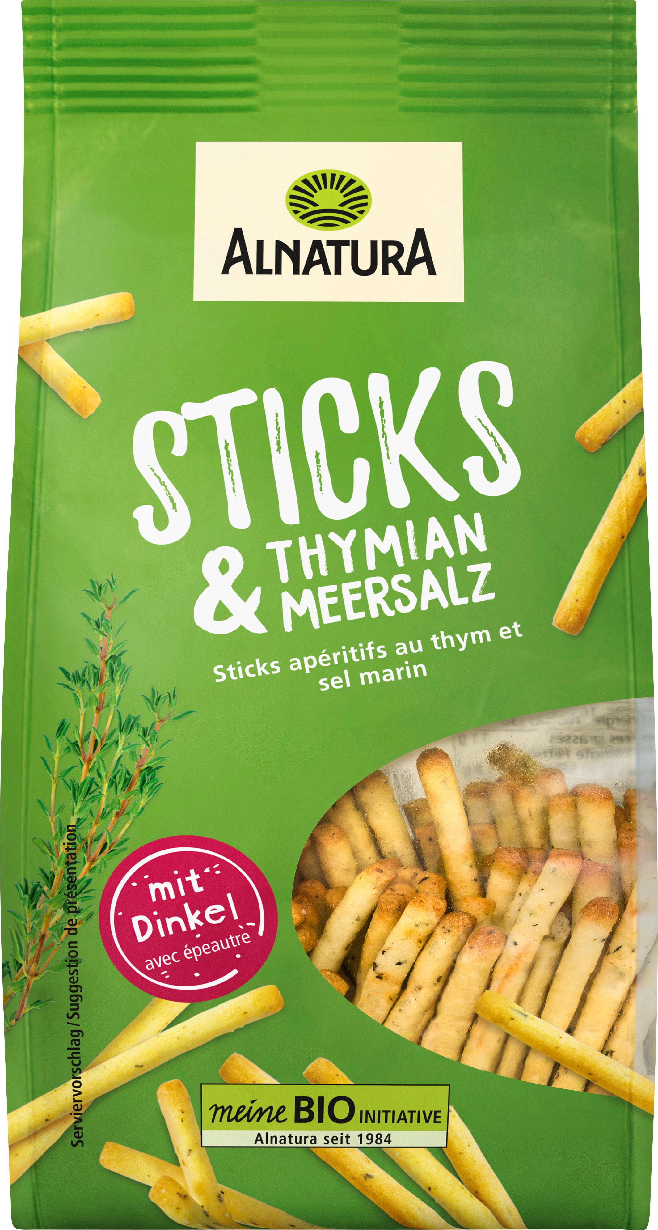 Spelt flour and potato flakes form the base of these extra-crunchy Organic Thyme & Sea Salt Sticks by Alnatura. Thyme and sea salt provide just the right amount of seasoning. They are perfect for enjoying with a dip or on their own as a snack. Made in Germany without flavourings or yeast extract.