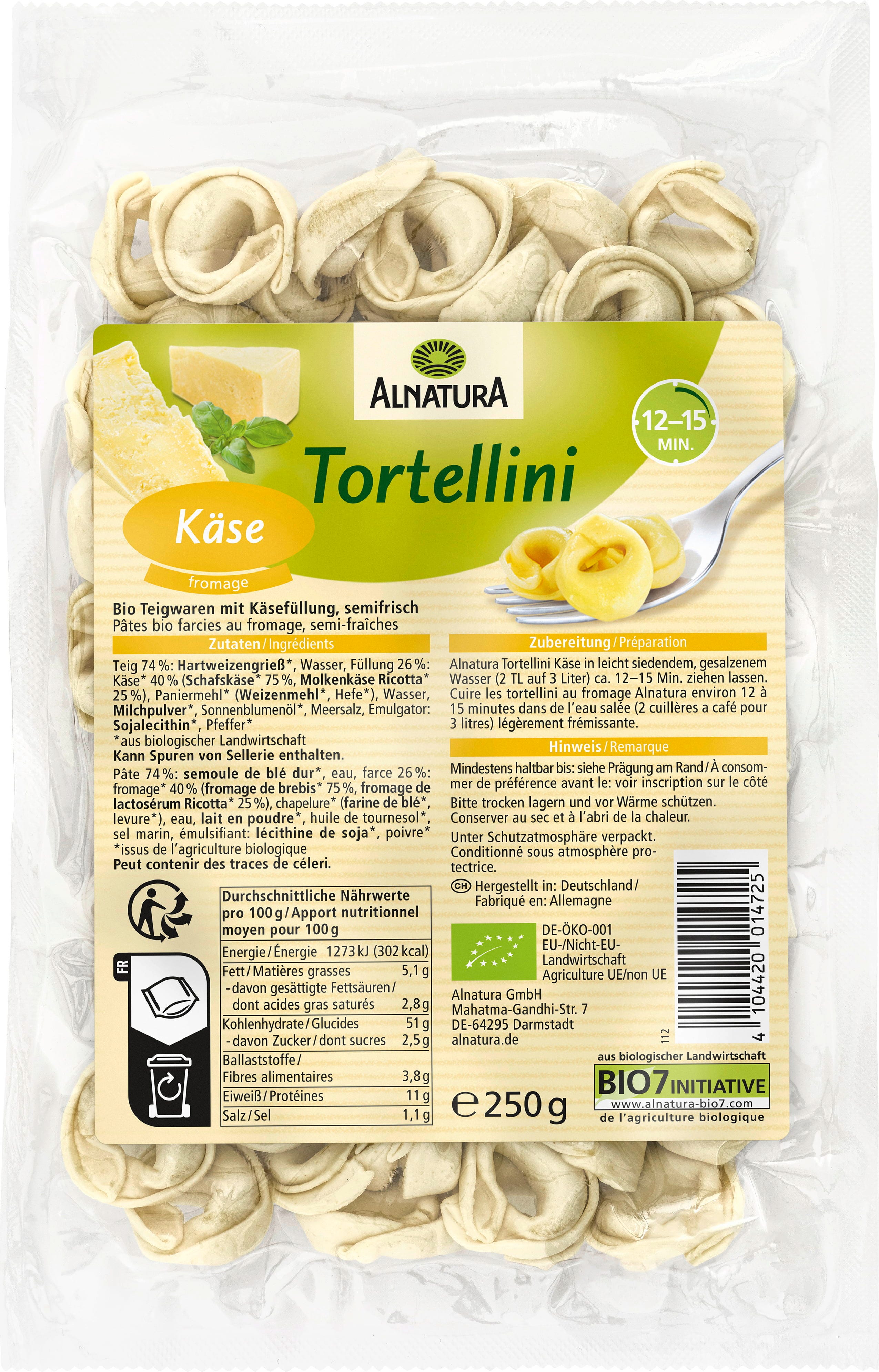Alnatura Semi Fresh Cheese Tortellini are delicious and ideal for quick meals. The pasta is made from durum wheat semolina and filled with a creamy cheese blend.