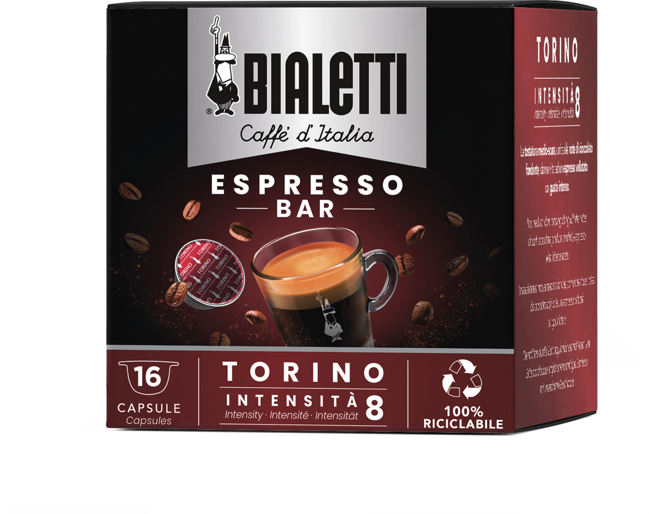 Bialetti's Torino capsules contain an intense espresso coffee balanced by the delicate aroma of chocolate. A tribute to a noble city with a venerable tradition of chocolate making, where the distinctive notes of chocolate and hazelnut blend with the fine aroma of espresso for a unique, velvety, full-bodied brew.
