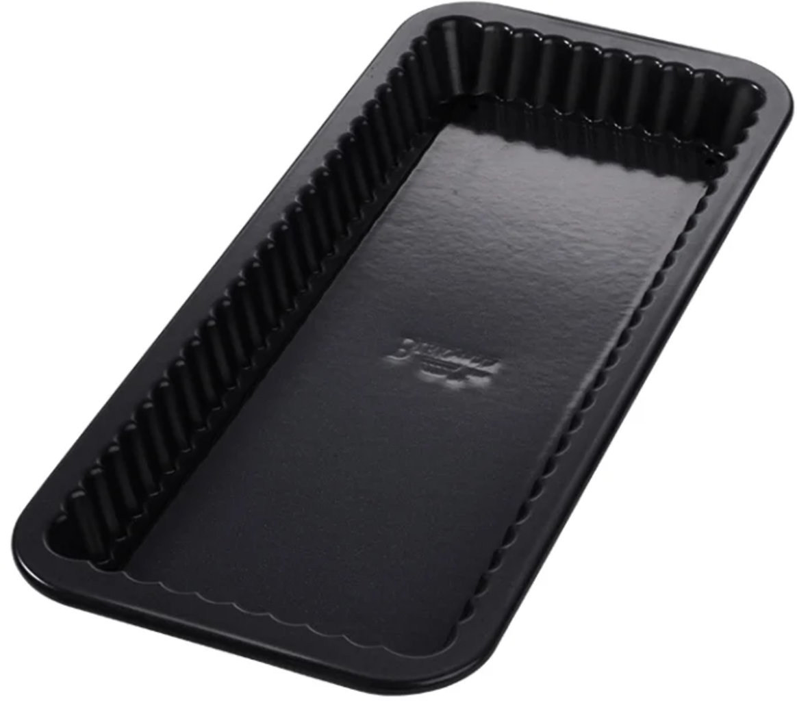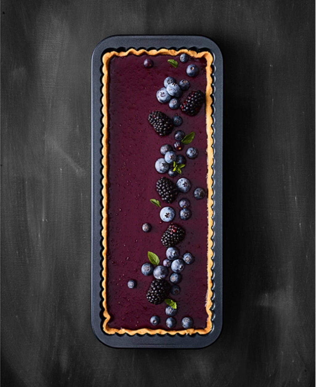 This rectangular tart tin made from premium carbon steel features a removable enamel base that is resistant to cuts and scratches. The exellent non-stick coating by Whitford ensures easy release and makes cleaning simple. Thanks to its exceptional material thickness and excellent heat conductivity, it delivers even baking results. The rolled rim provides a secure grip – even when wearing oven mitss. Heat-resistant up to 230 °C. Includes a recipe suggestion.
