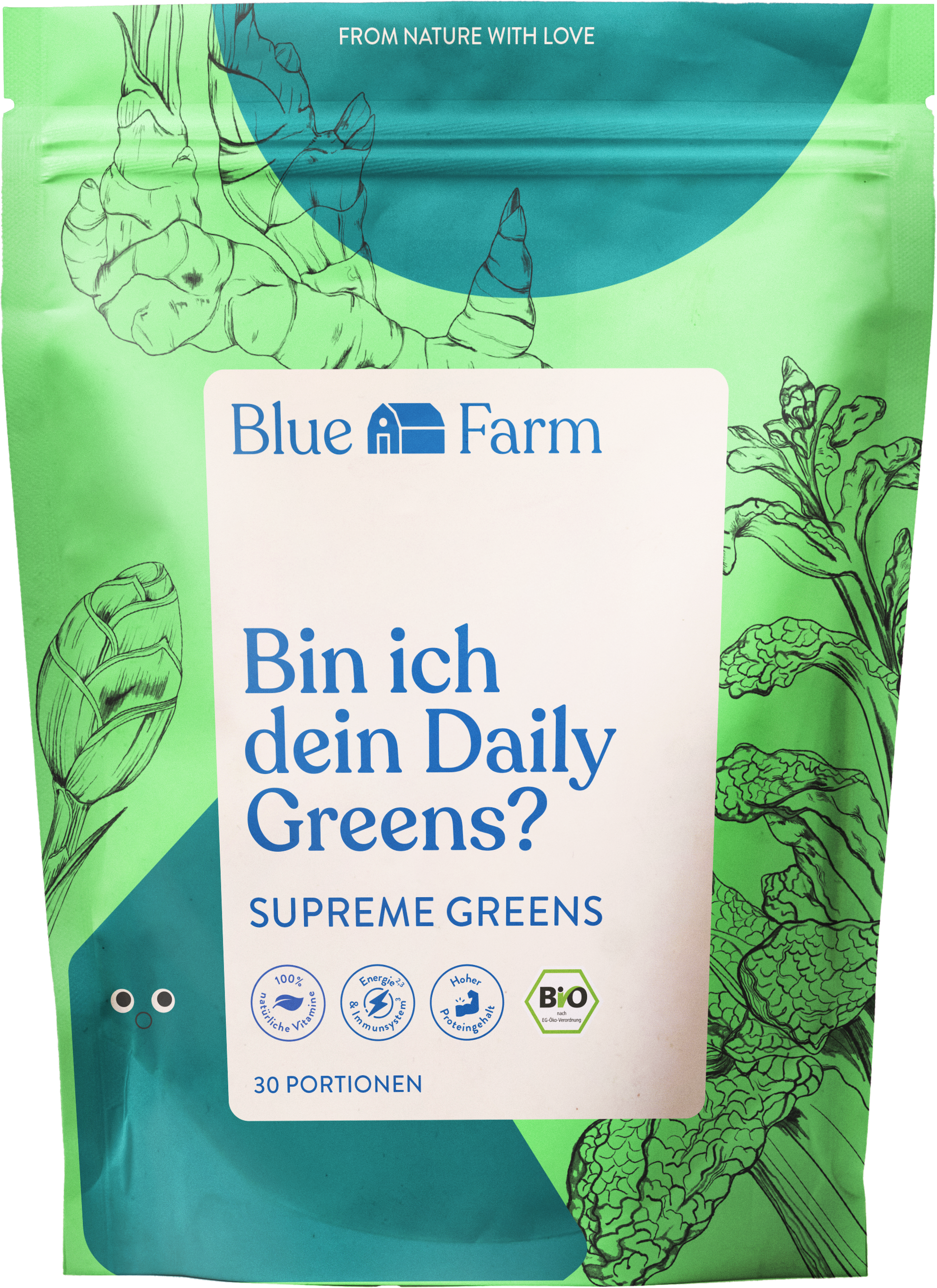 Organic Supreme Greens drink powder by Blue Farm is a nutrient-rich blend of organic fruit and vegetable powders, algae, proteins and adaptogens from vital mushrooms. Free from added sugar, the powder is an easy all-in-one solution for your daily routine. With its simple preparation using water or plant-based milk, Supreme Greens is ideal for anyone short on time but who still values variety and quality.