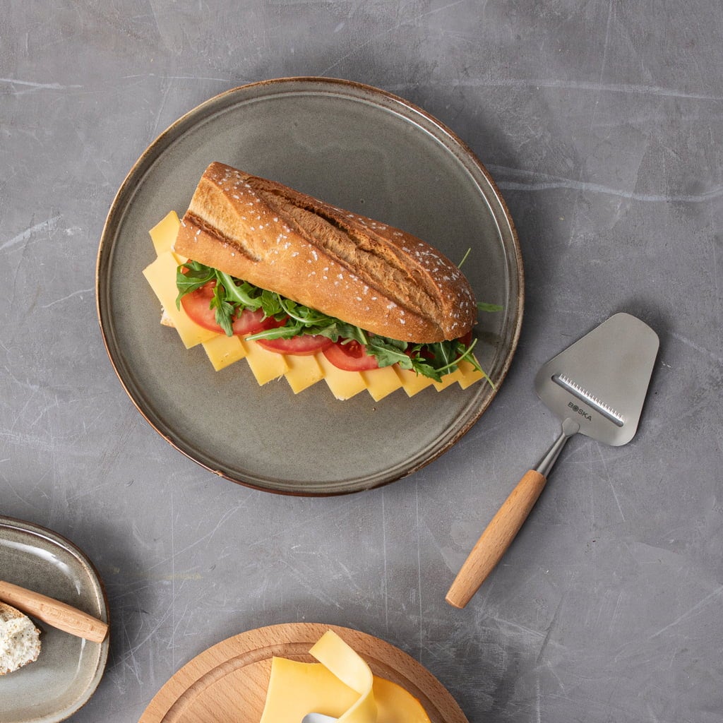 Meet your new kitchen helper: this handy cheese slicer with a rustic beechwood handle. It cuts mature and aged cheese into perfect slices every time, and is also ideal for hard vegetables such as cucumbers, thanks to its robust stainless steel blade. The non-stick BSF™ treatment ensures that the cheese does not stick to the slicer. With an ergonomic handle for more comfort when in use.