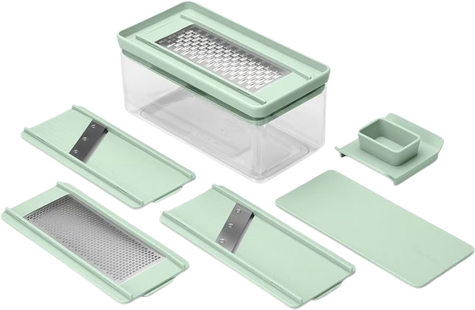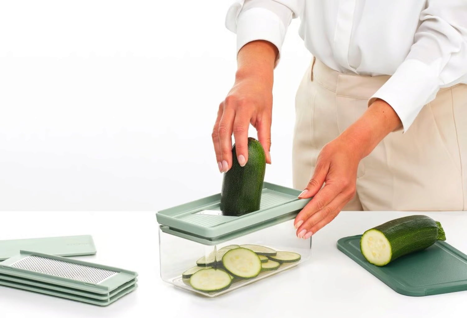 Meal prep has never been easier! This slicer and grater set makes light work of every kitchen task – from finely grating cheese and coarsely shredding vegetables to slicing with precision. It combines four versatile functions in one clever design. With a non-slip base, handy collection container and smart finger guard, you can slice and grate safely, cleanly and efficiently. Best of all? Everything stores neatly inside the container after use. Practical, stylish and made for everyday life.