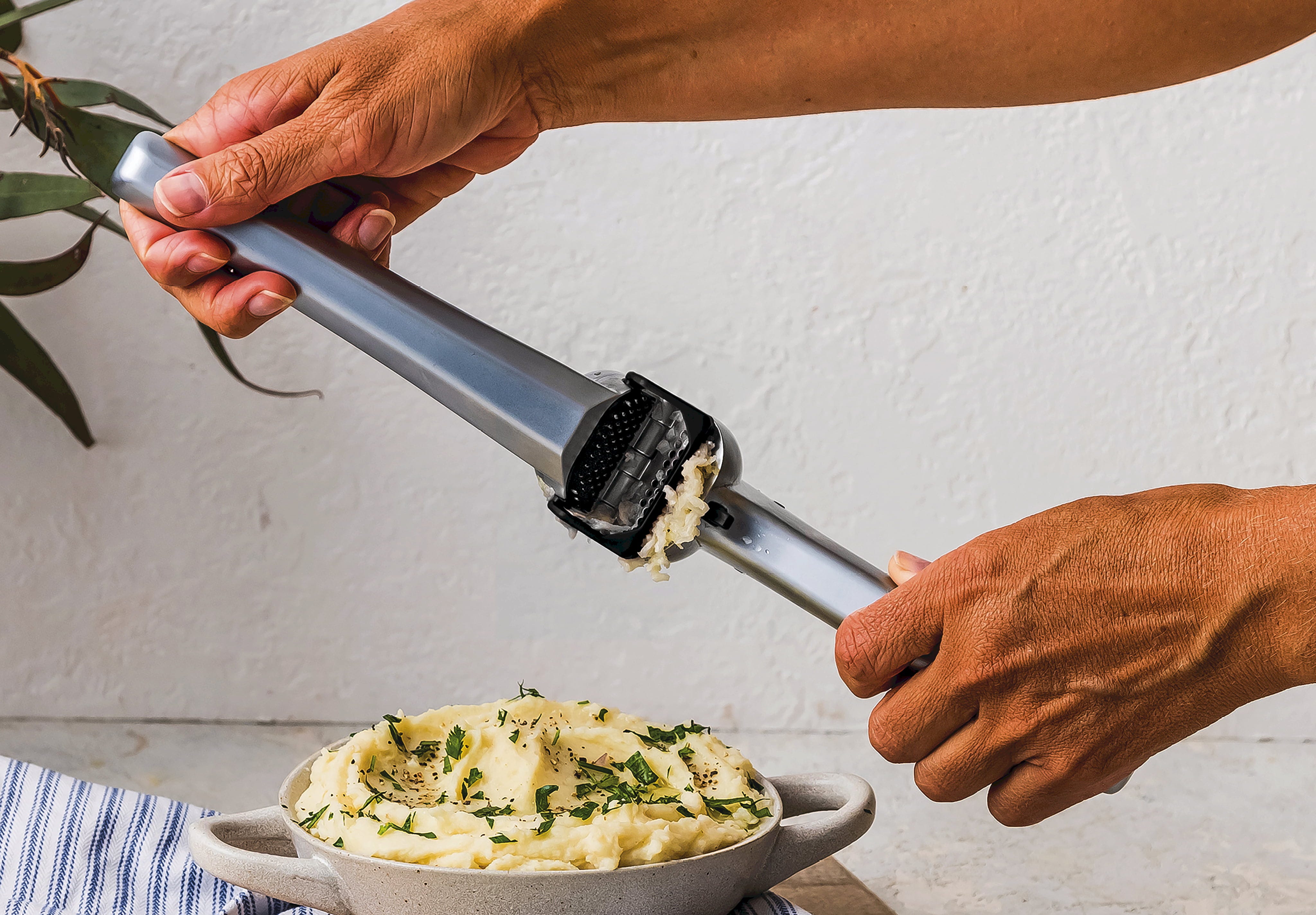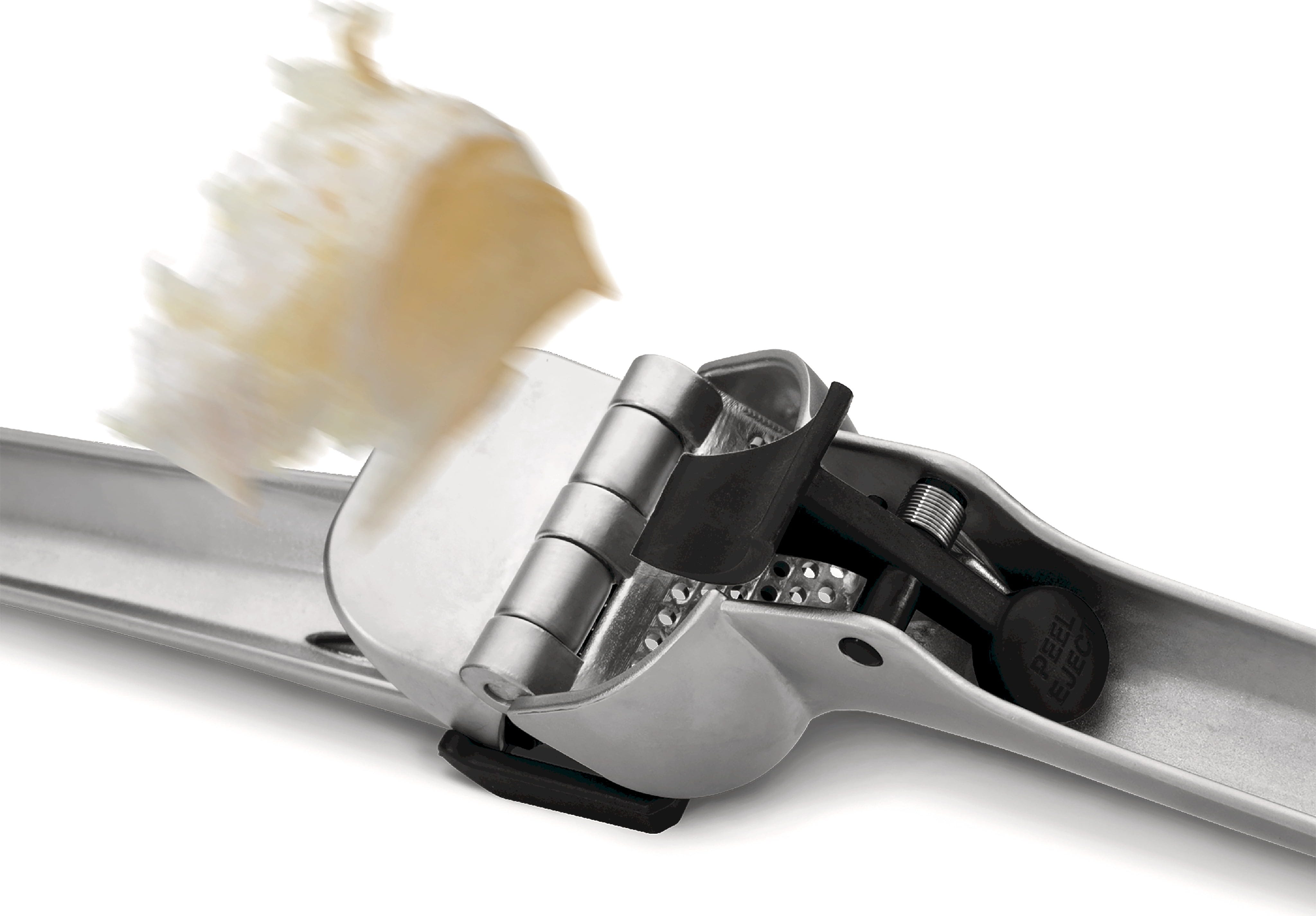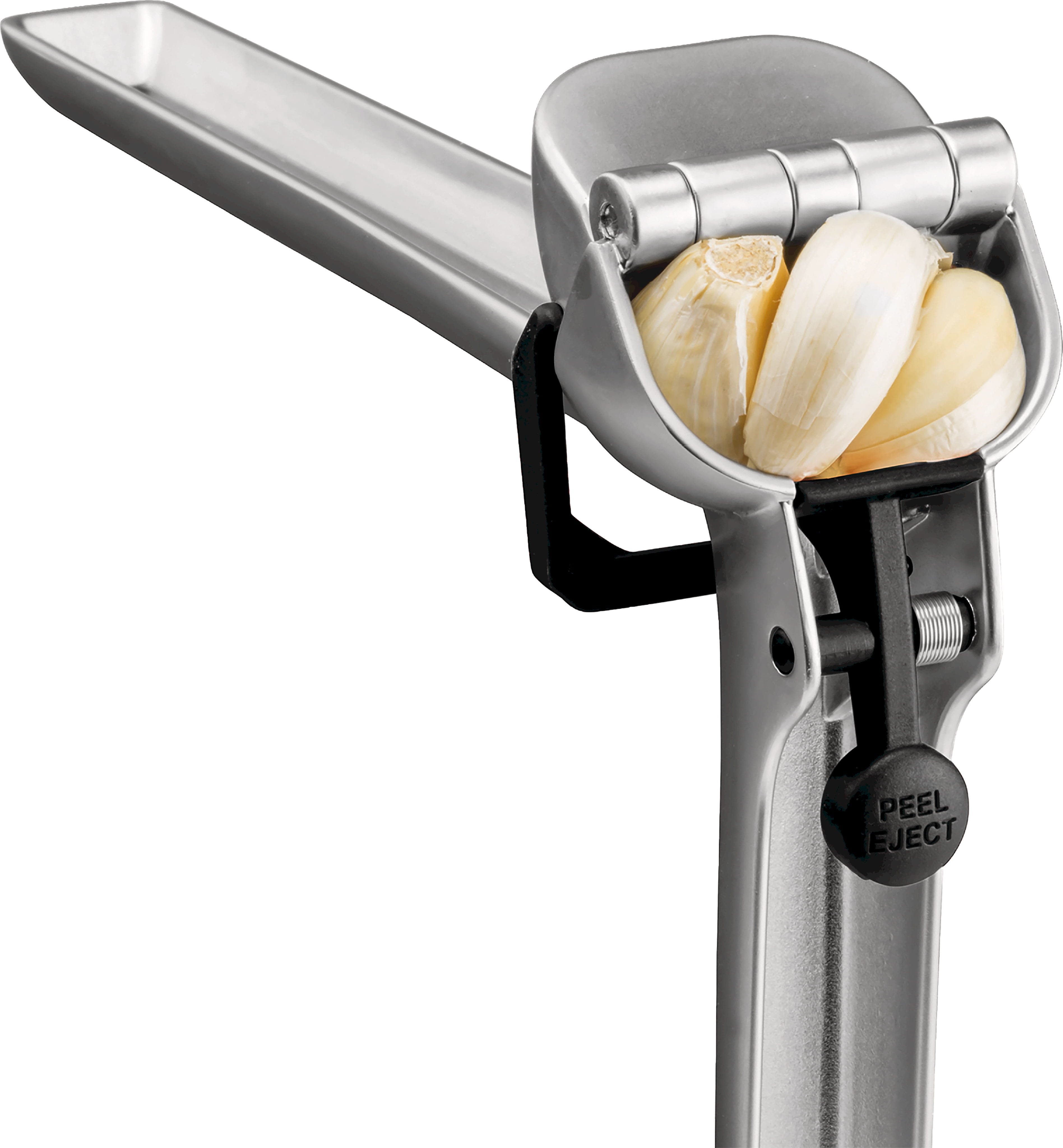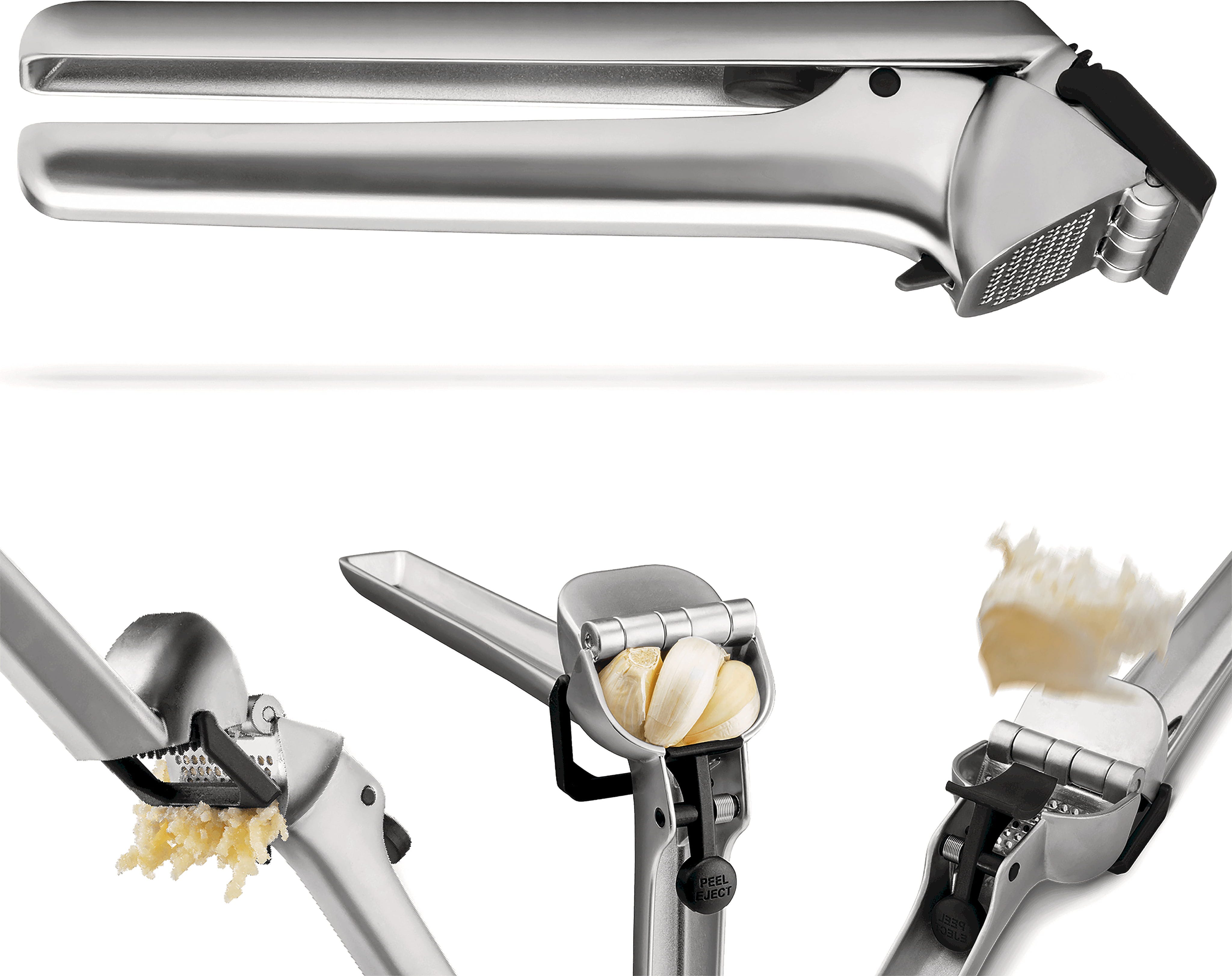As you open the handles, an integrated scraper automatically clears any residue from the surface, while the "Peel Eject" button conveniently shoots out the empty skins. This keeps your hands garlic-free and ensures the press is ready to go again after a simple rinse.