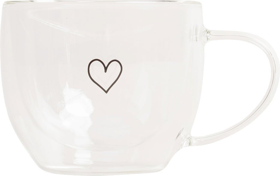 The double-walled glass mug with a heart print turns drinking tea or other hot drinks into a special experience. The double-walled design makes the drink look as if it is floating, while the exterior remains pleasantly cool - no matter where the cup is touched, the fingers and hands remain protected. The mug is embellished with a small black heart on the glass wall, which makes it even more aesthetically pleasing.