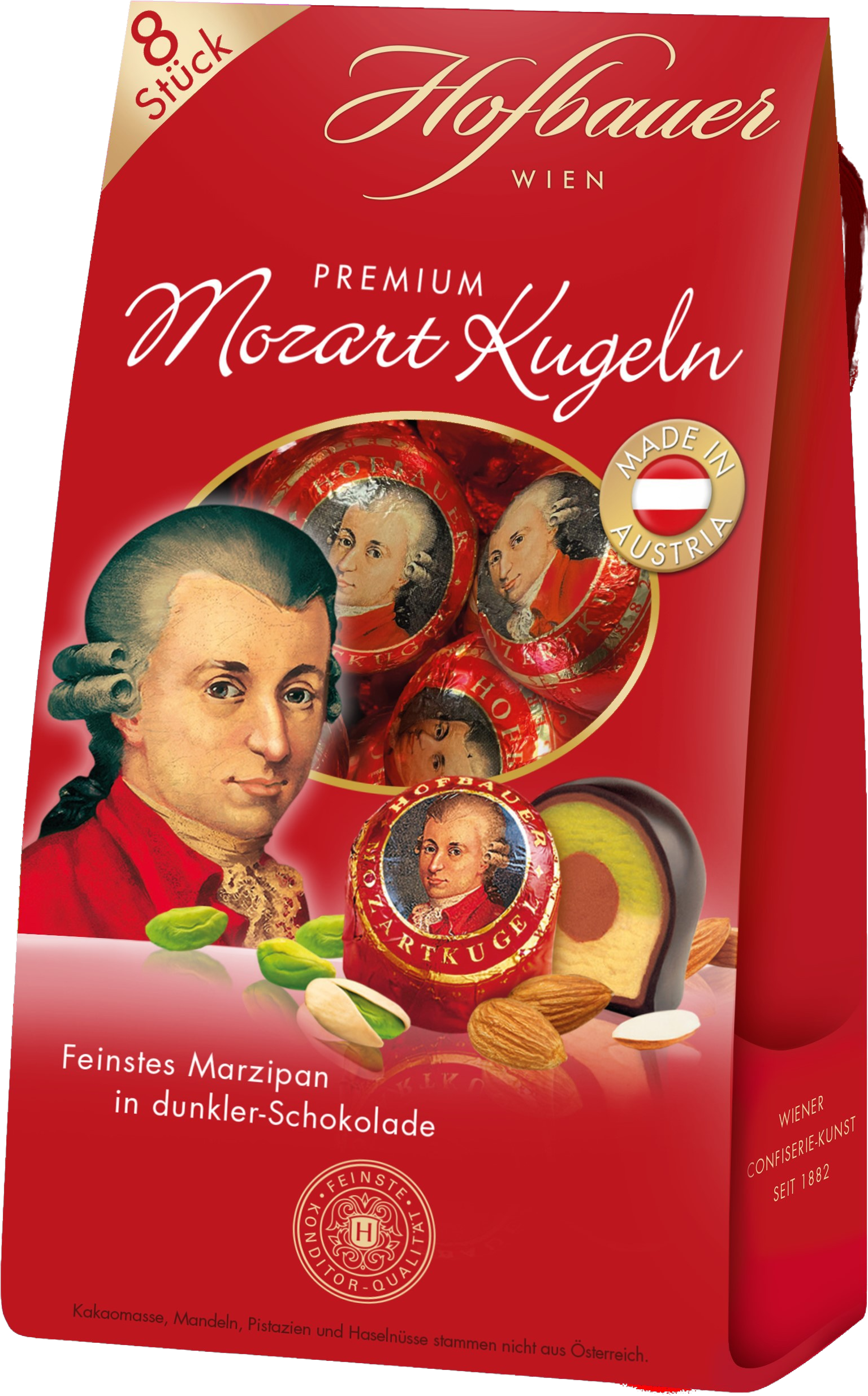 Experience the perfect symphony of fine Viennese confectionery tradition with dark chocolate. Hofbauer dark chocolate Mozart Kugeln combine the finest marzipan, aromatic pistachio marzipan and creamy hazelnut nougat cream to create a harmonious composition of flavours. Encased in high-quality dark chocolate, these pralines are an exquisite indulgence for those who love fine confectionery.