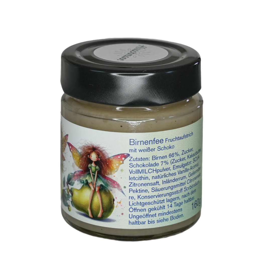 Pears, sugar, white chocolate and natural vanilla come together to create this divinely delicious sweet spread. The Pear Fairy fruit spread is also ideal for baking or in desserts. Sure to delight elves and fairies of all ages!
