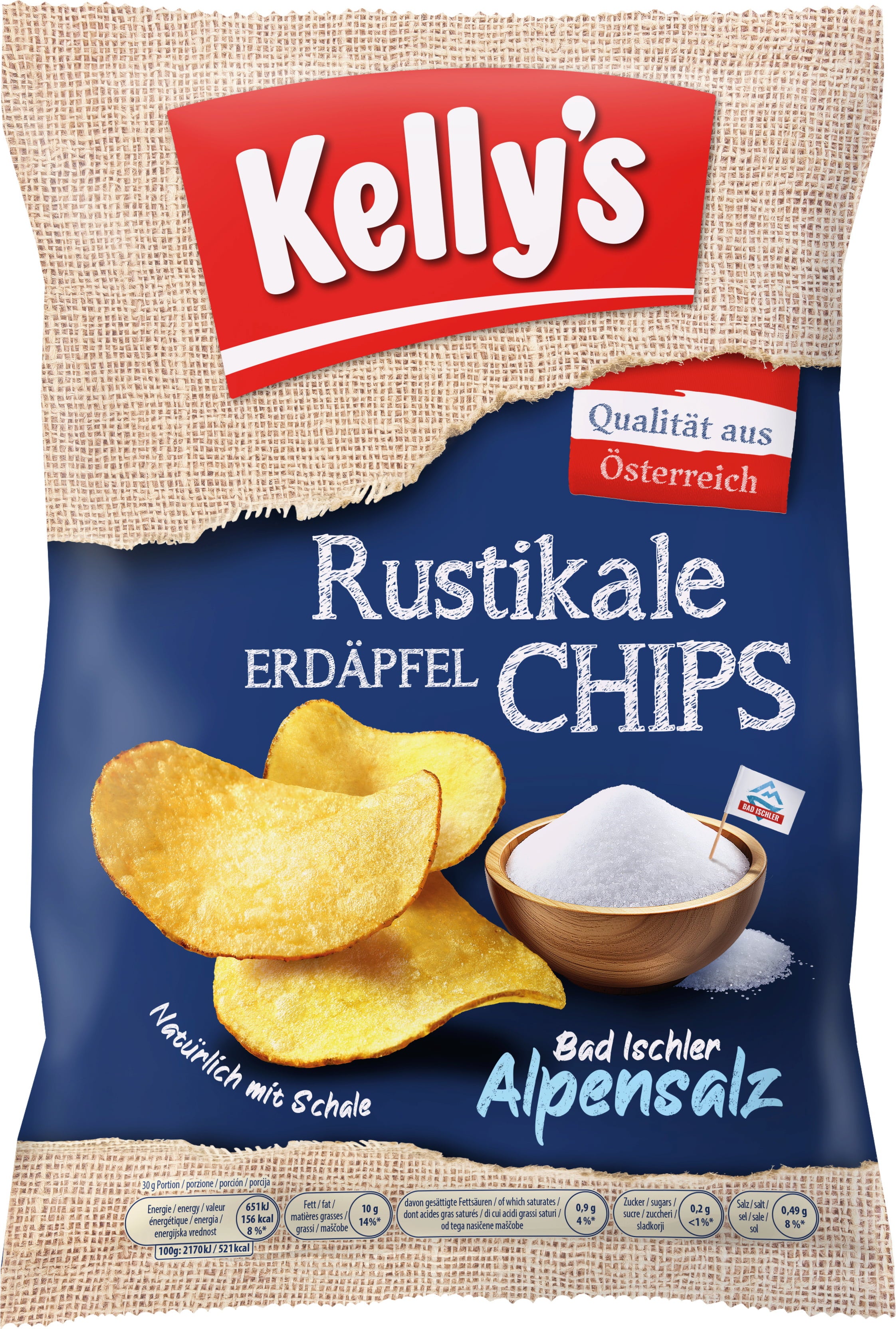 Kelly's Rustic Potato Crisps with Bad Ischl Alpine Salt are made from carefully selected potatoes, processed to create an exceptionally crunchy chip. Seasoned with mild Alpine salt, they offer an intense yet balanced flavour. Whether enjoyed as a classic snack between meals or shared at relaxed parties with friends, these crisps are the perfect snack that everyone reaches for with their natural taste and perfect seasoning.