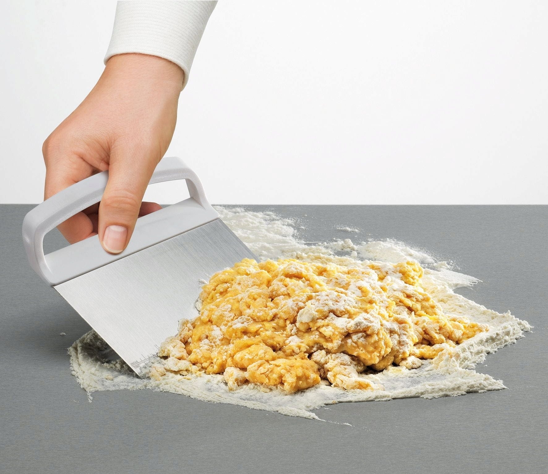 - Stainless steel dough cutter with measurement markings for portioning dough quantities
