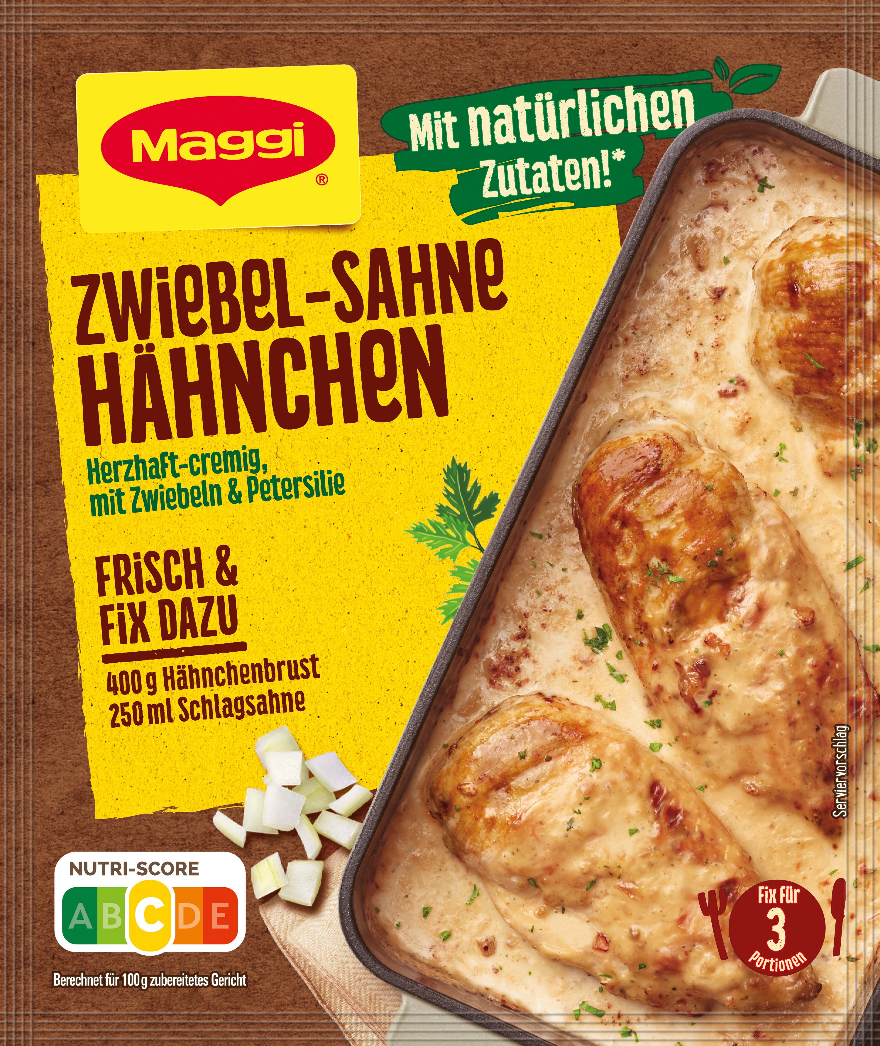 Place 400 g chicken breast in an ovenproof dish. Mix the Maggi Fix seasoning mix with 250 ml whipping cream, pour over the chicken and bake until golden.