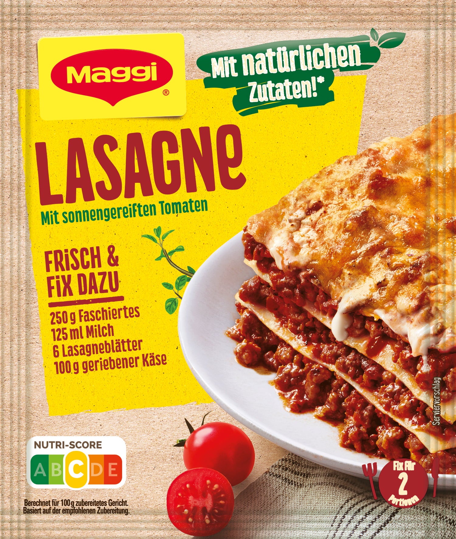 Fresh lasagne with a savoury tomato sauce, fine herbs and a golden cheese topping - without the extra effort? With Maggi Fix for Lasagne, this Italian classic is ready in no time. The perfectly balanced blend of spices delivers hearty flavour. Quick, easy and always delicious.