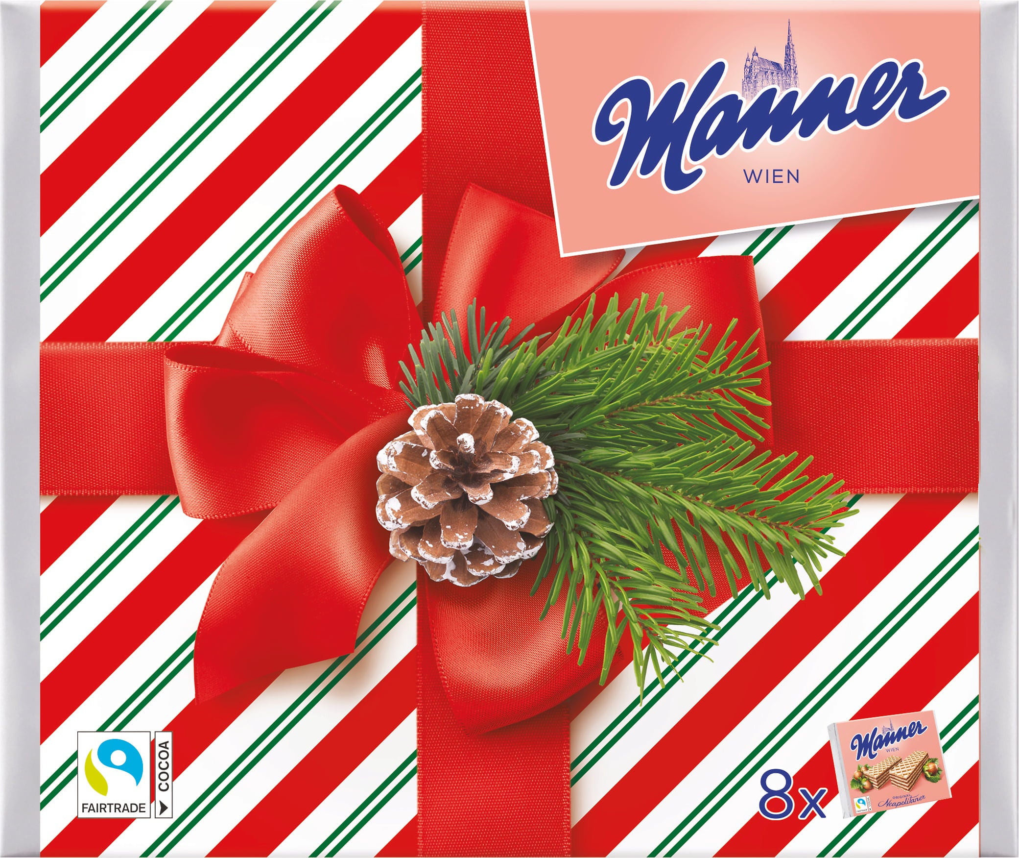 The perfect gift for those who love Manner wafers - crisp wafers filled with aromatic Neopolitaner cream in a large pack with a festive Christmas design. The special edition pack contains 8 packs of wafers, each weighing 75 grams. The recipe is egg-free.