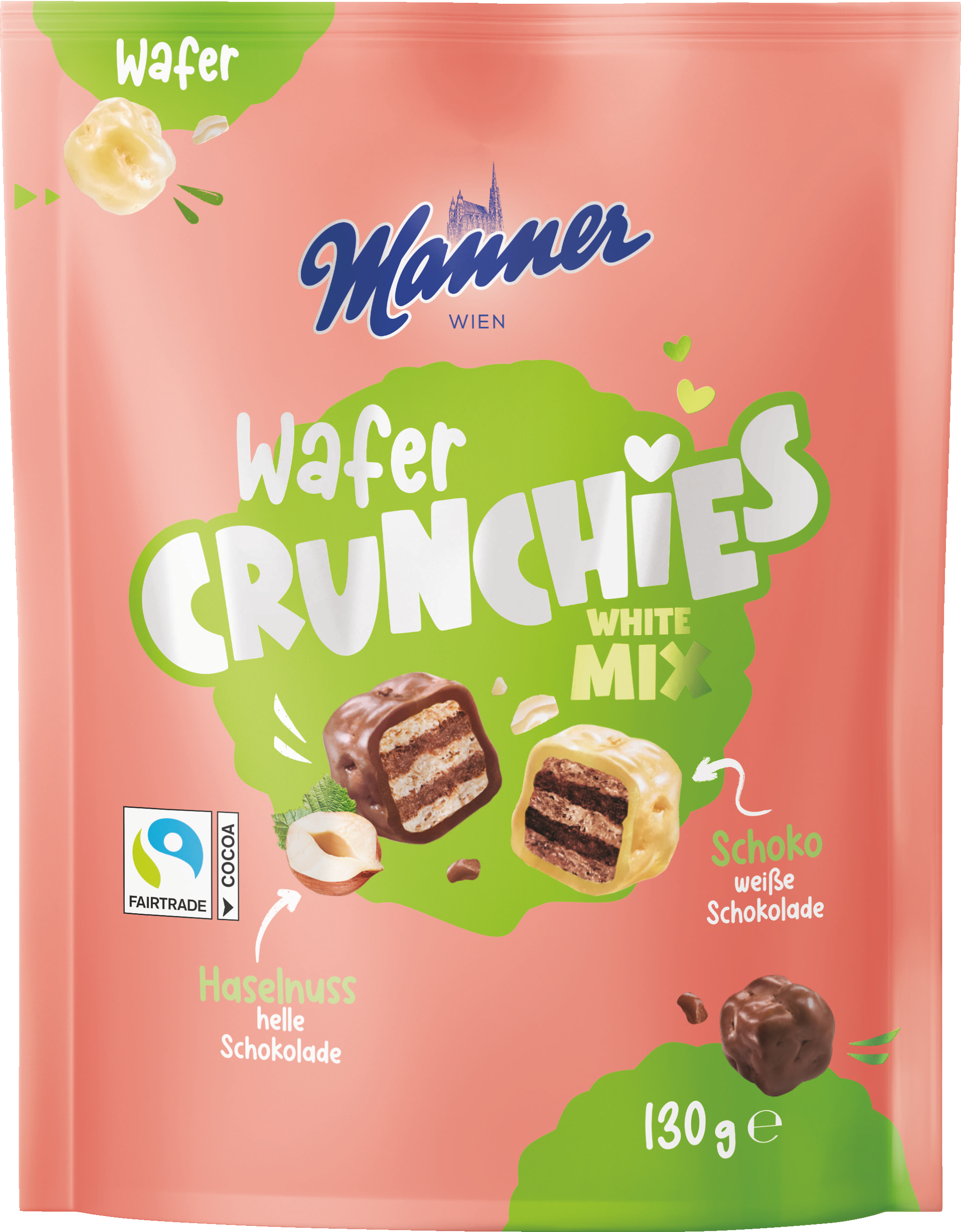 Manner Wafer Crunchies White Mix are ideal as a snack at any time. An exciting and irresistible combination of crunchy hazelnut wafer cubes encased in fine milk chocolate and fine wafers in a white chocolate layer. Perfect for on the go, at the office or while binge-watching your favourite series on the couch.