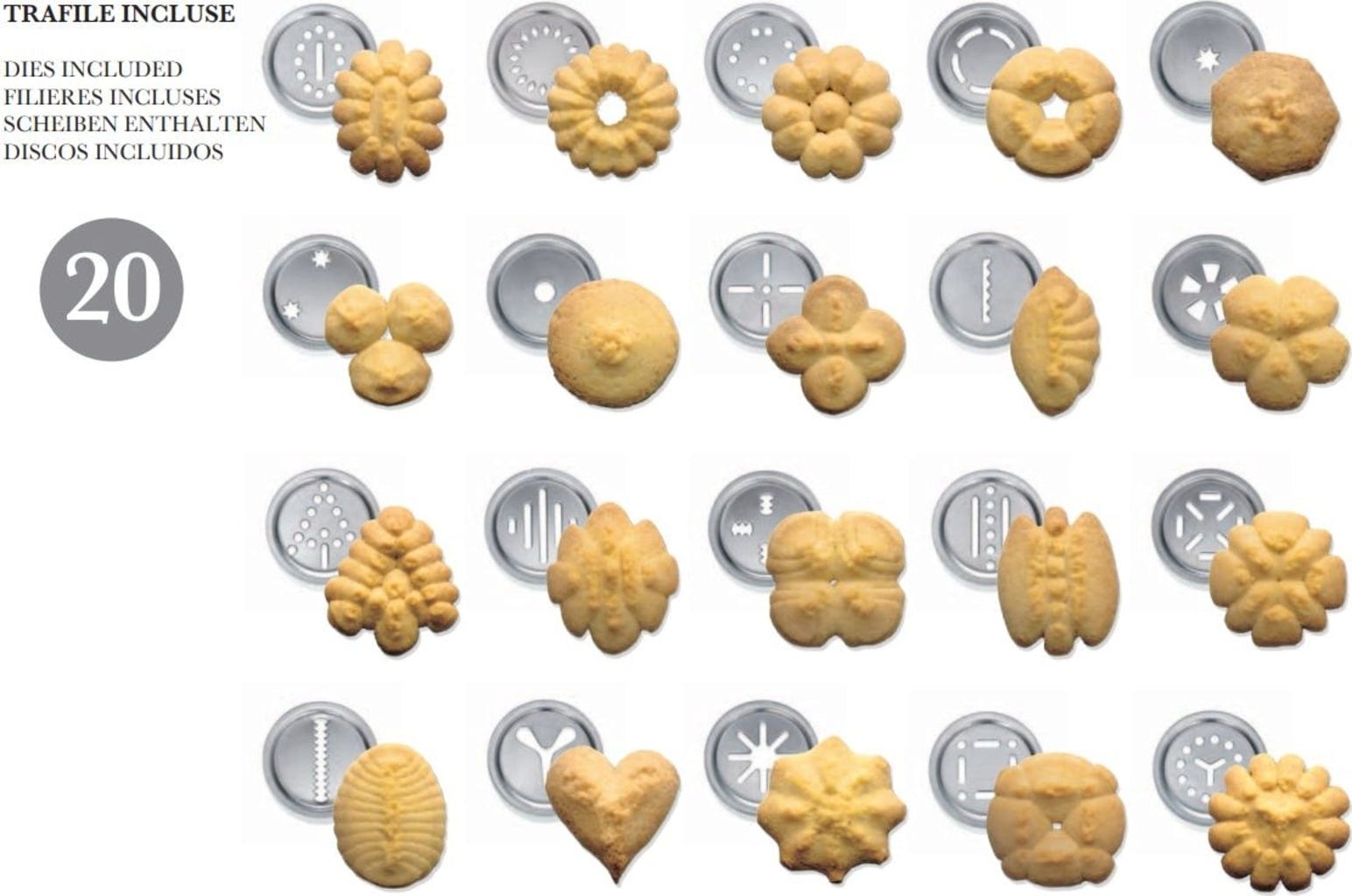 Make biscuits in 20 different shapes with this beautiful press! Just fill the press with dough, choose the shape that you like and press out your cookies.