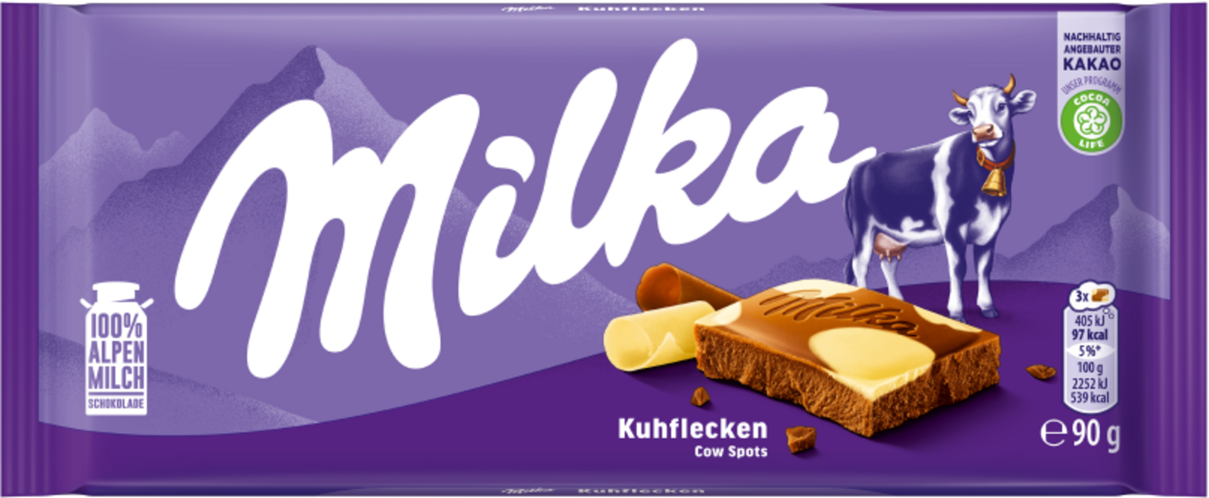 Tender milk chocolate or aromatic, sweet white chocolate? The Milka Happy Cows chocolate bar saves you from having to make this difficult choice! The creamy, melting alpine milk chocolate with cute spots of white chocolate simply combines both. The cute design mimicking Alpine cows is particularly popular with children.