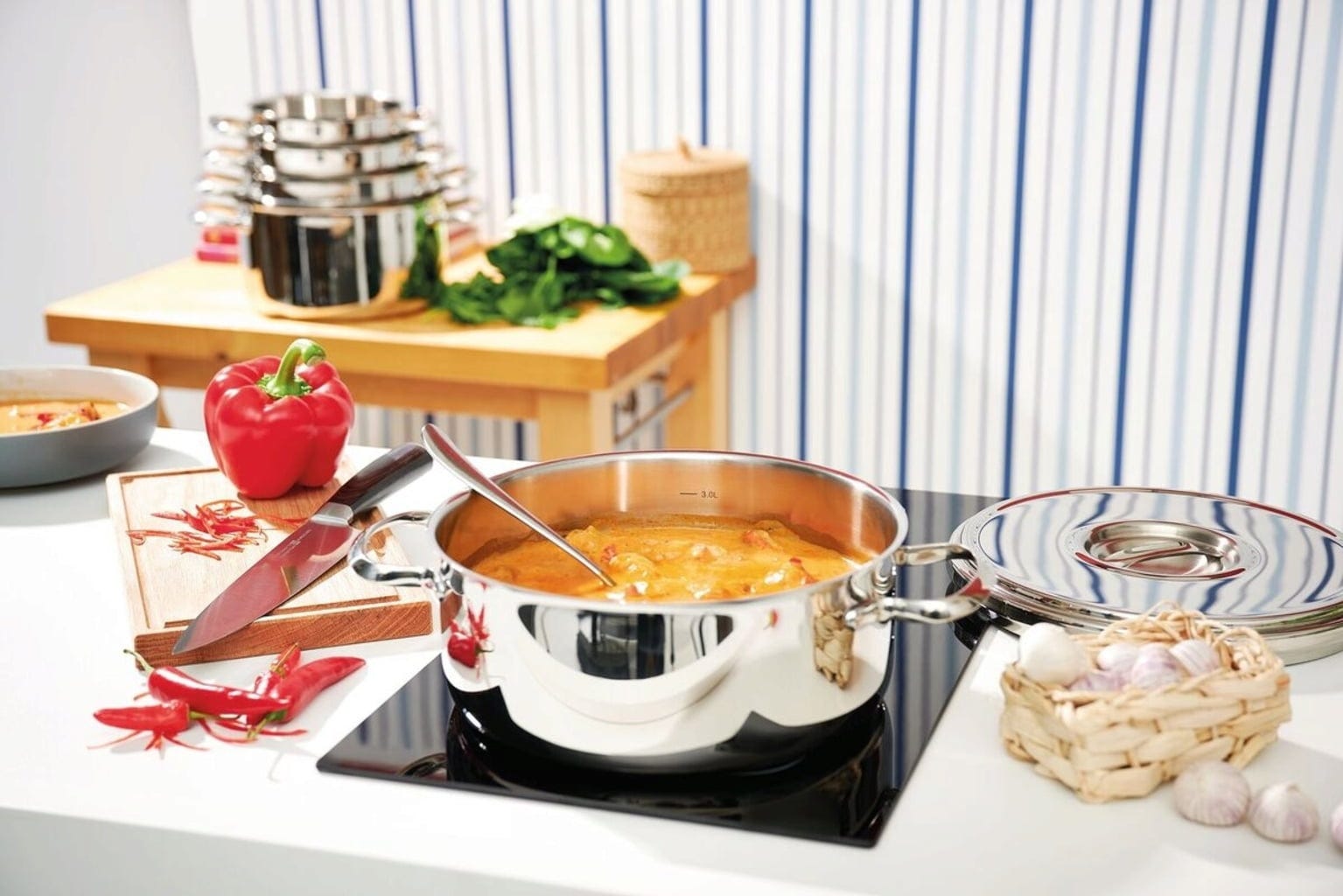 The Romana i casserole has been inspiring cooks for more than 40 years! Not surprising, because it is a multipurpose pot that can be used on all stove types thanks to its sturdy copper bottom. Carefully considered features such as the perfectly shaped rim that ensures neat, spill-free pouring and the scale markings on the inside make it very practical and useful.