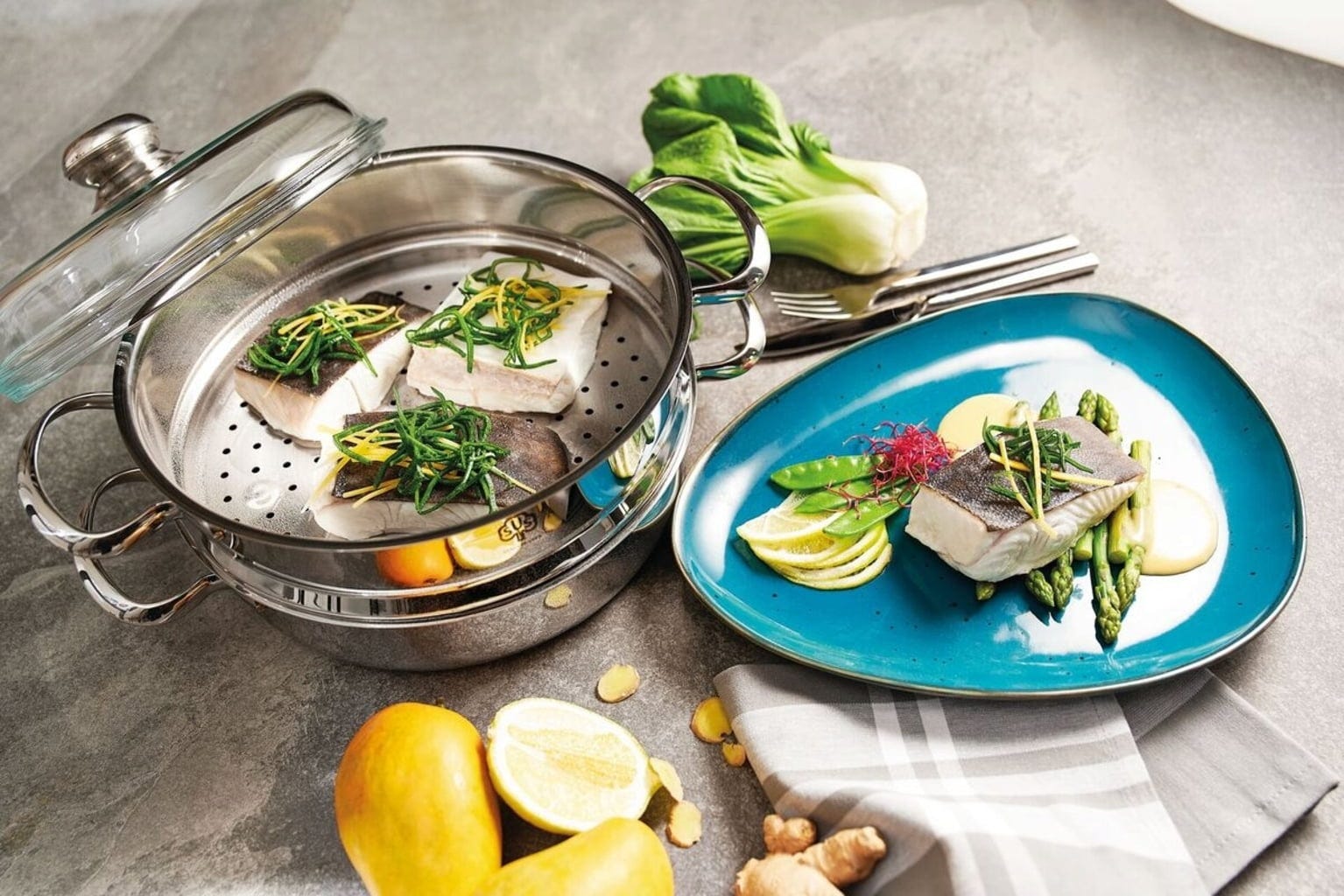 Pot with steamer attachment and lid - this high-quality trio is an indispensable cooking accessory in every kitchen. High-quality stainless steel and a special protherm® copper base save energy while cooking and can be used on all stove tops. Robust and easy to clean.