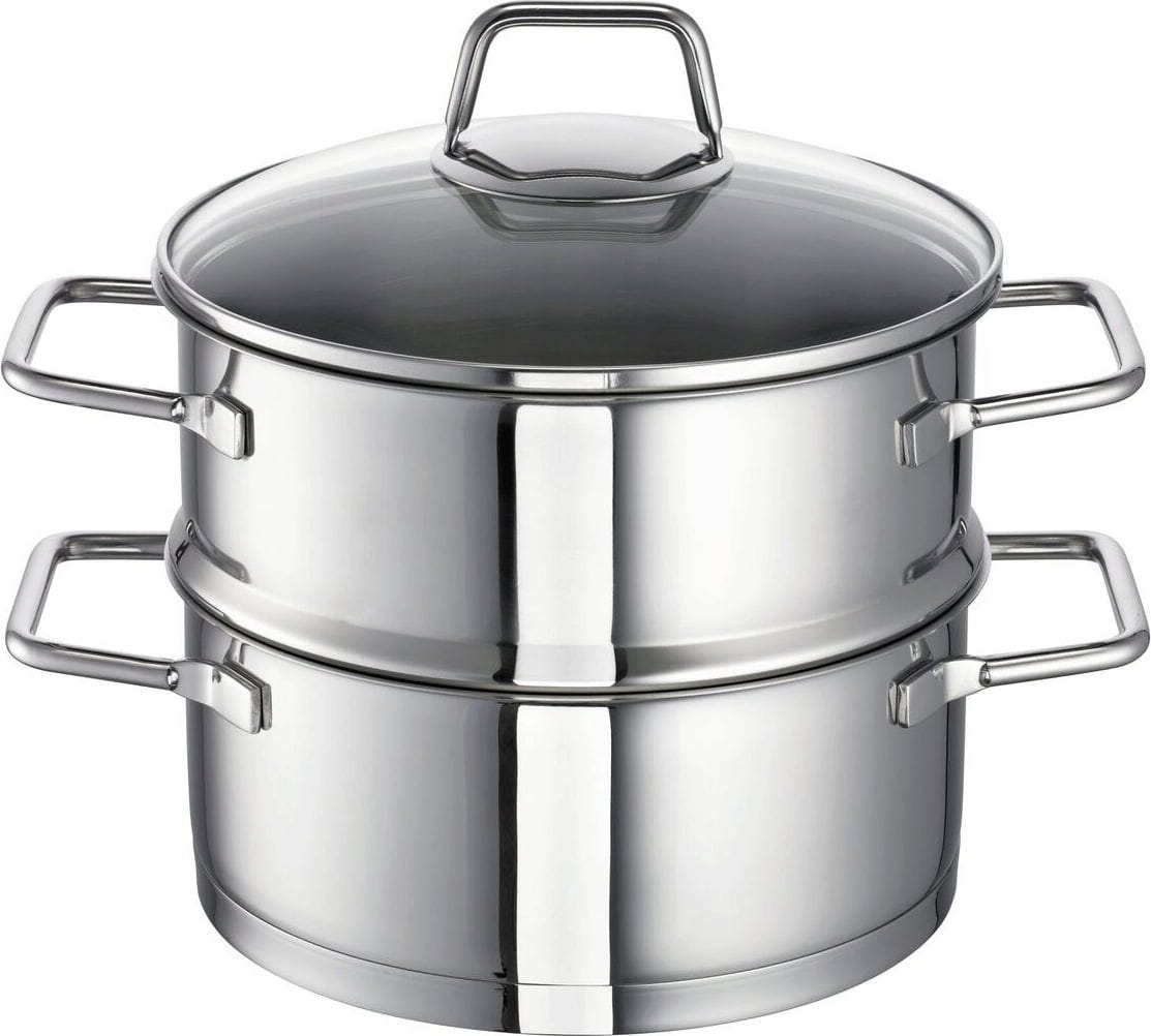 Whether as a saucepan or as a steamer, this practical combination from the Wega series will inspire fantastic meals in your kitchen for many years to come. The ecotherm® aluminium capsule base helps to save energy and is suitable for use on all stovetops. It also features other practical extras such as the measuring scale marked on the inside and the pouring rim for neat, spill-free pouring.