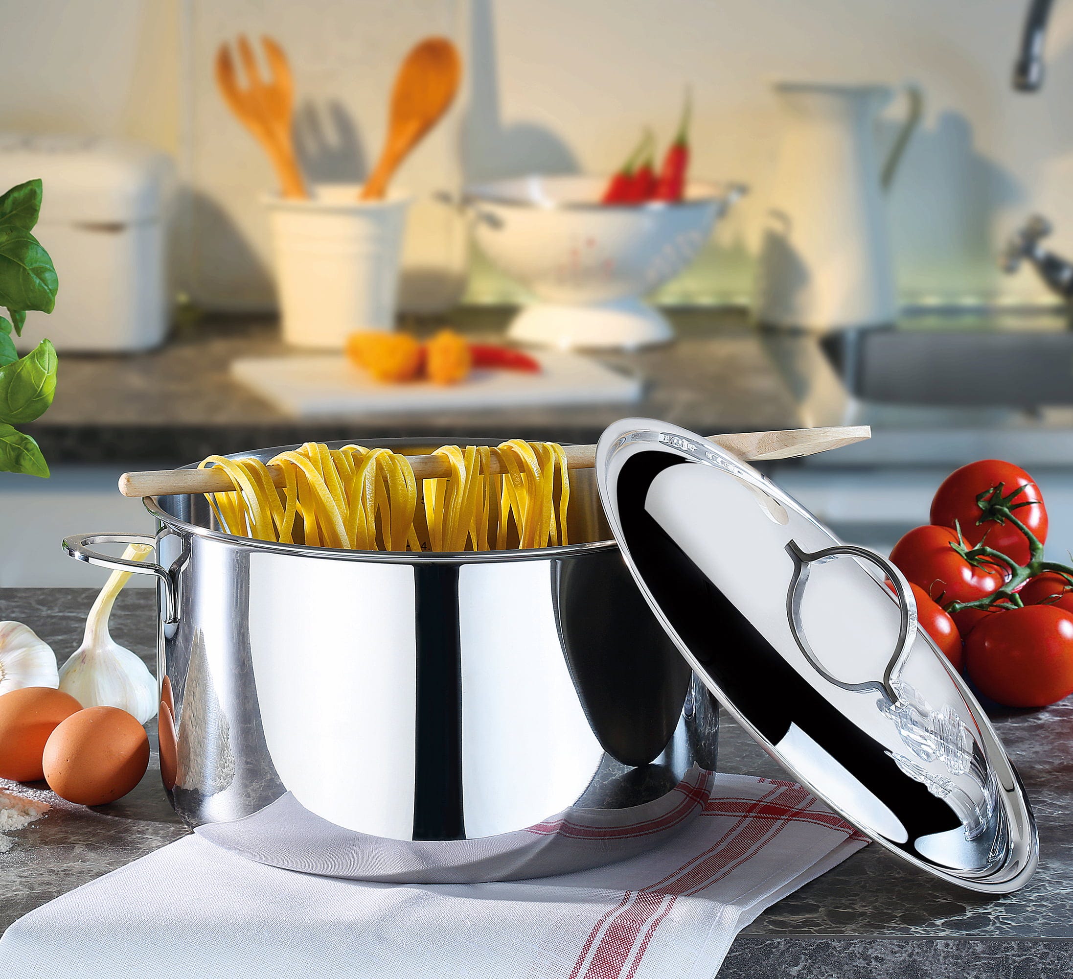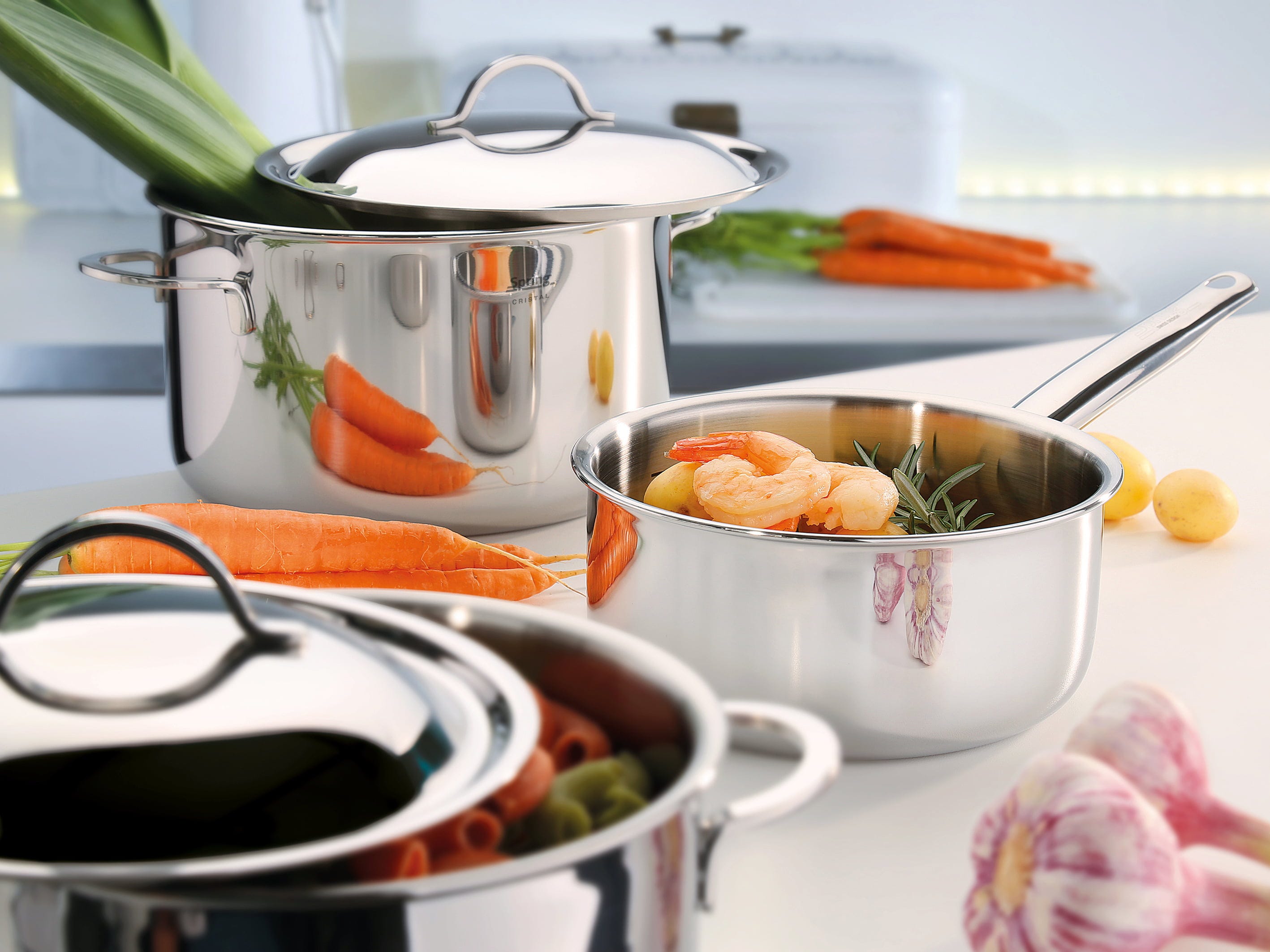 For over 25 years, the Cristal series has been the centrepiece of every sophisticated kitchen. What makes it special is the high-quality 5 multi-layer material that conducts the heat not only at the base, but directly through the walls into the entire food. The result is extremely energy-saving, even and fast heating, which optimally preserves the vitamins and colours of your ingredients.