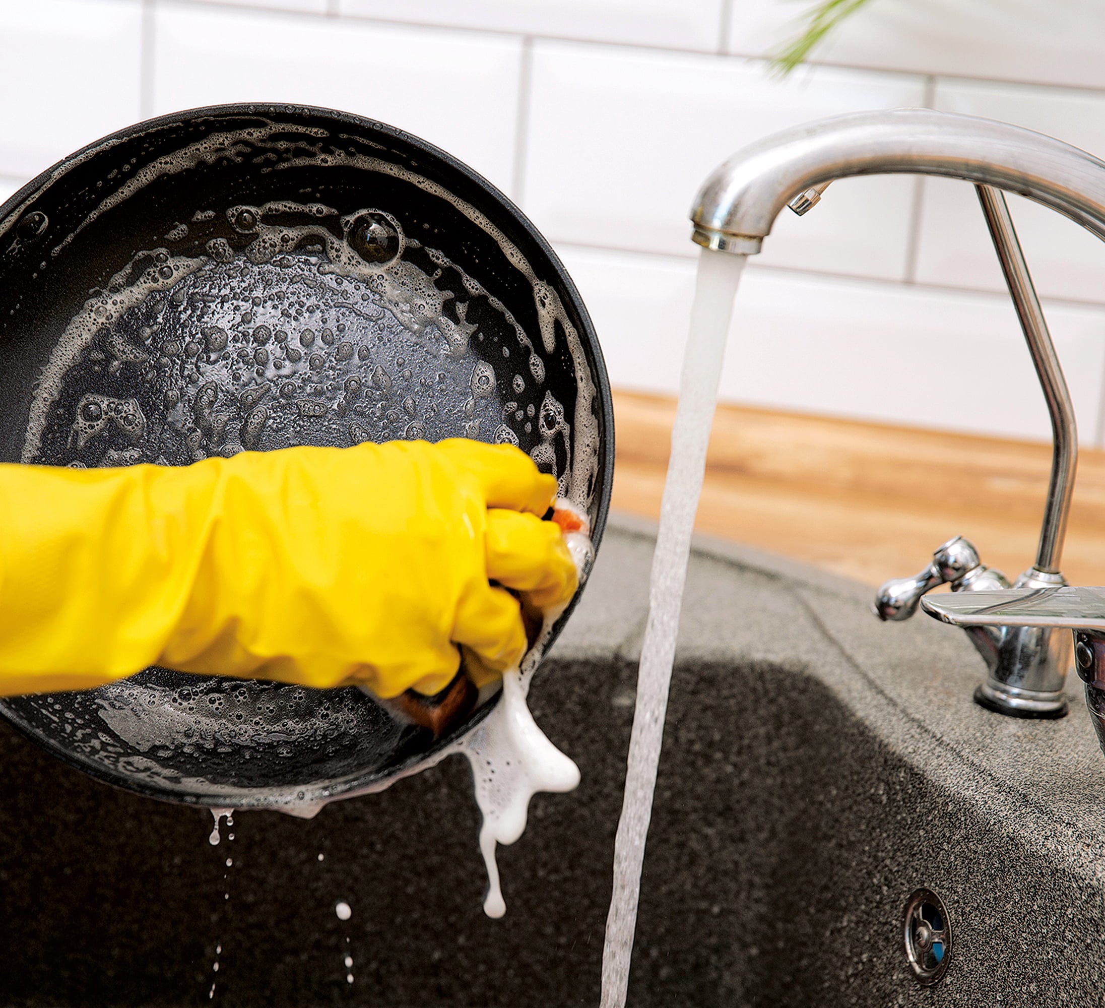 - It is best to clean the pan by hand, not in the dishwasher. Do not use hard plastic sponges, steel wool, cleaning pads or scouring agents.
