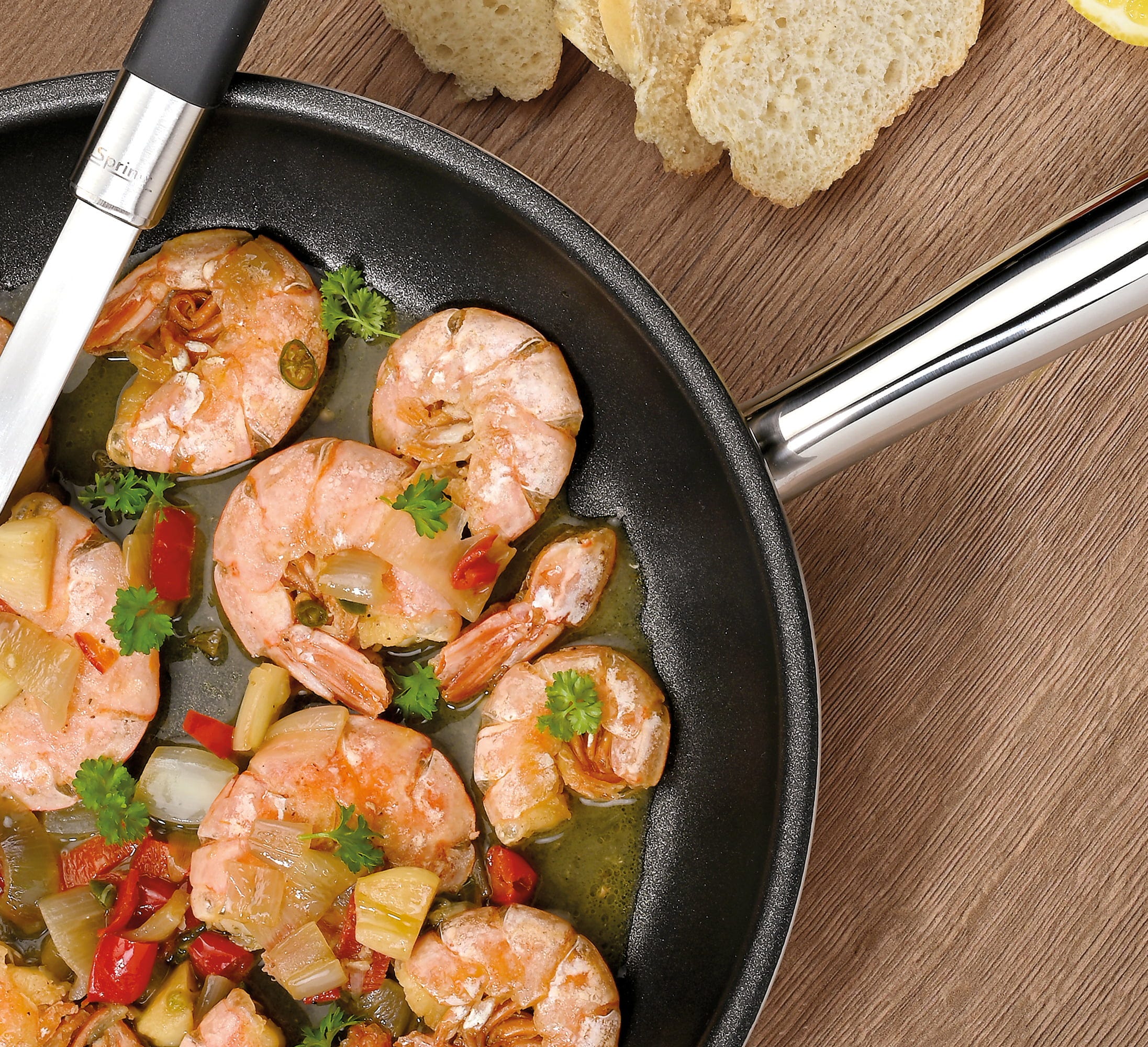 The Vulcano Intense Pro by Spring brings real professional quality to the kitchen. Thanks to the innovative 5 multi-layer material with triple aluminium core, the heat is distributed absolutely evenly and at lightning speed right up to the high rim, giving you full control when frying. The inner seal is reinforced with genuine Swiss rock crystals, making it extremely resistant, so you can even use metal spatulas without worrying about damaging the surface.