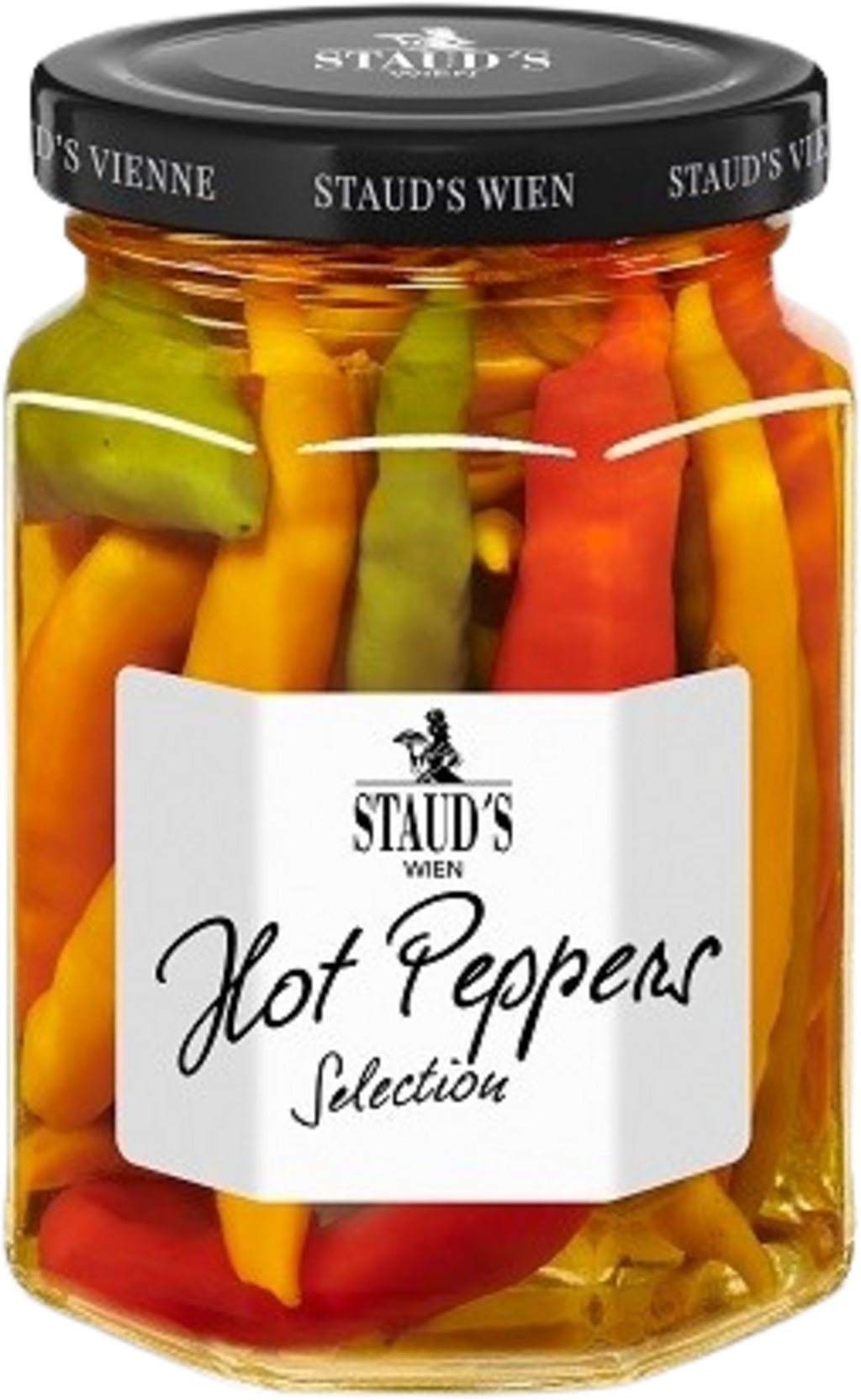Hot peppers are popular aroma carriers for many culinary creations. At Staud's, the flavourful and spicy green, yellow and red chillies are preserved in spirit vinegar. Included are pepper varieties such as Kilian and Kristan which are allowed to ripen fully under the sun in Burgenland (Seewinkel region) before being harvested and processed. The pretty peppers are a wonderful addition to salads, spreads and appetiser platters. They can also be used to season warm dishes.