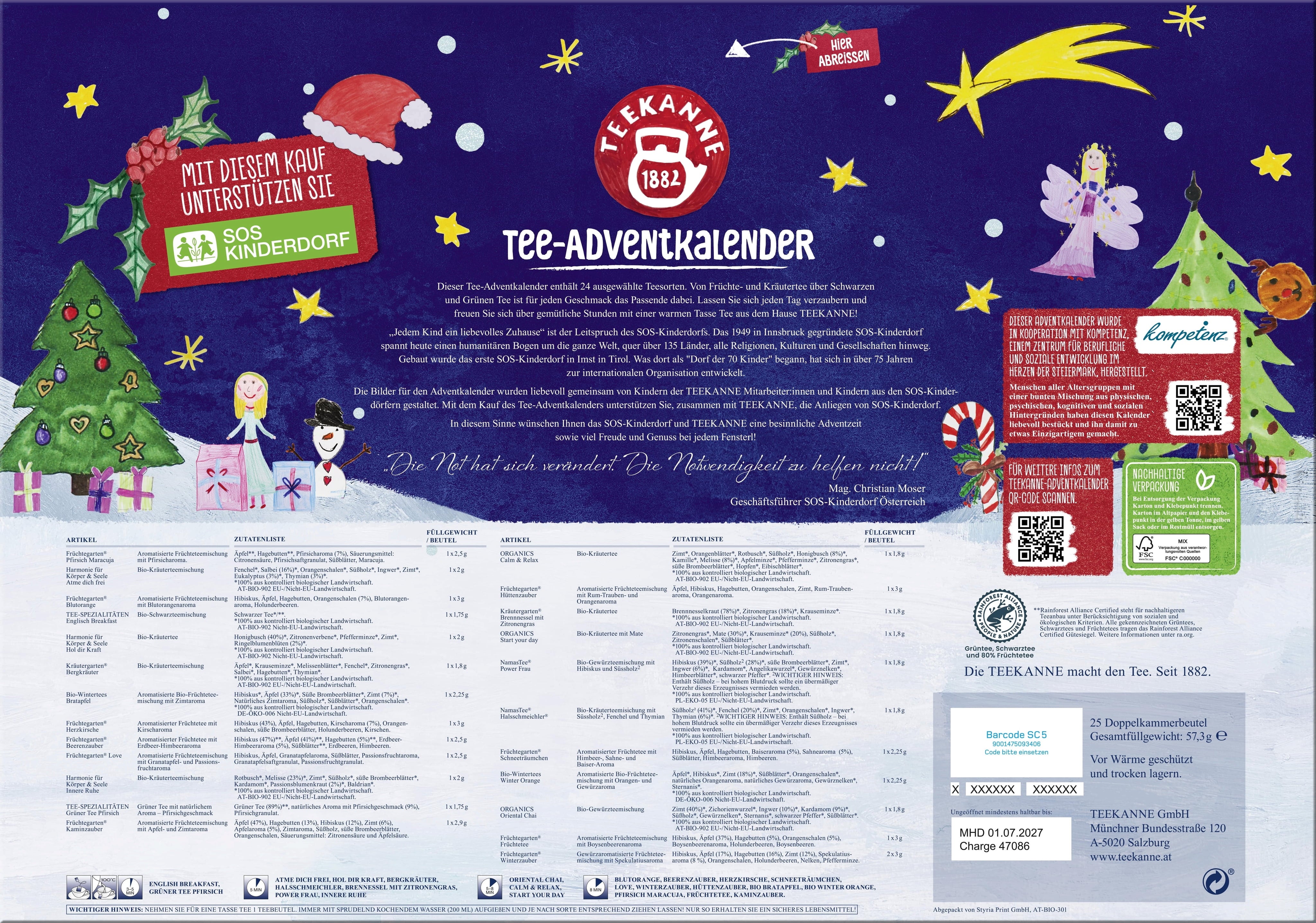 24 delightful teas to brighten your Advent season! From cosy winter evenings to precious tea breaks and relaxed moments with loved ones – this Advent calendar offers 24 wonderful tea varieties to suit every taste. Whether you enjoy fruity, herbal or spiced tea blends, with or without black or green tea, each tea bag is a delicious little surprise to discover and savour. The lovingly illustrated packaging was designed by children from the SOS Kinderdorf and the children of TEEKANNE employees. The artwork can even be reused as charming gift tags. The packaging is eco-friendly – with no plastic inlays or cellophane wrapping.
