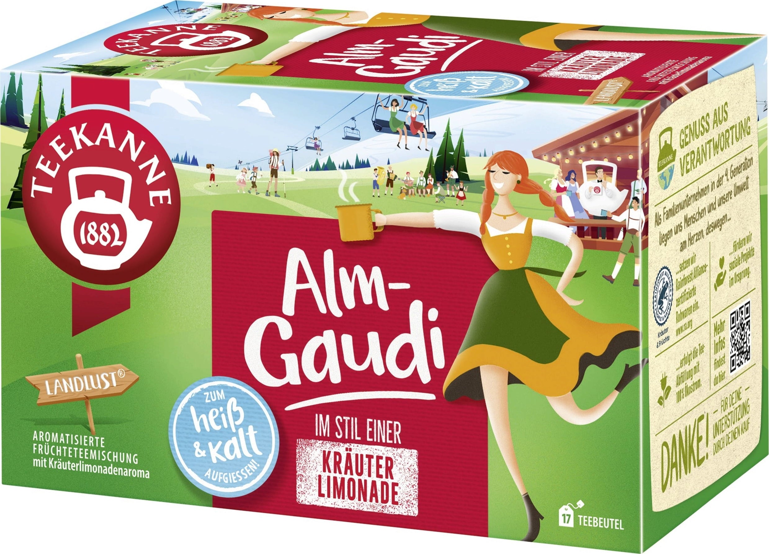 Treat yourself to a taste of Austrian joy – in every cup! TEEKANNE Landlust Almgaudi tastes just like a trip to Austria's fabled high mountain pastures: herbaceous, fresh and full of flavour. Enjoy it hot as a warming herbal punch or cold as a refreshing herbal spritzer – this tea is perfect for every season. With its unique taste of freedom, nature and alpine charm, it brings that unmistakable feeling of Austria's mountain charm straight into your home.