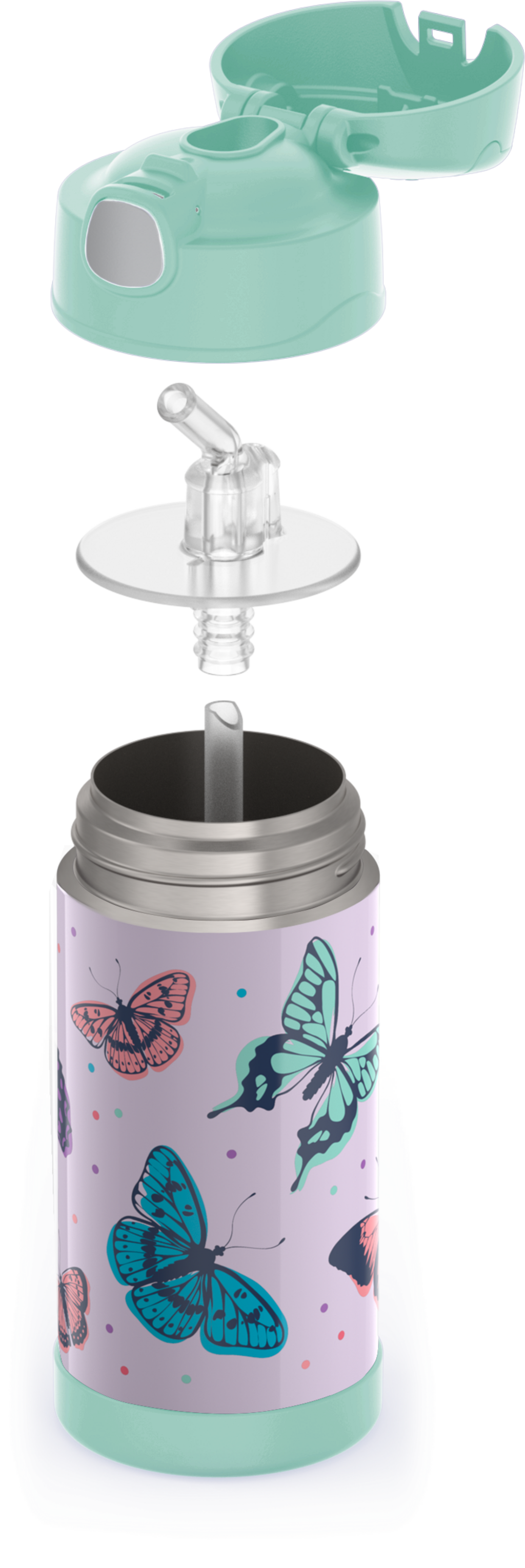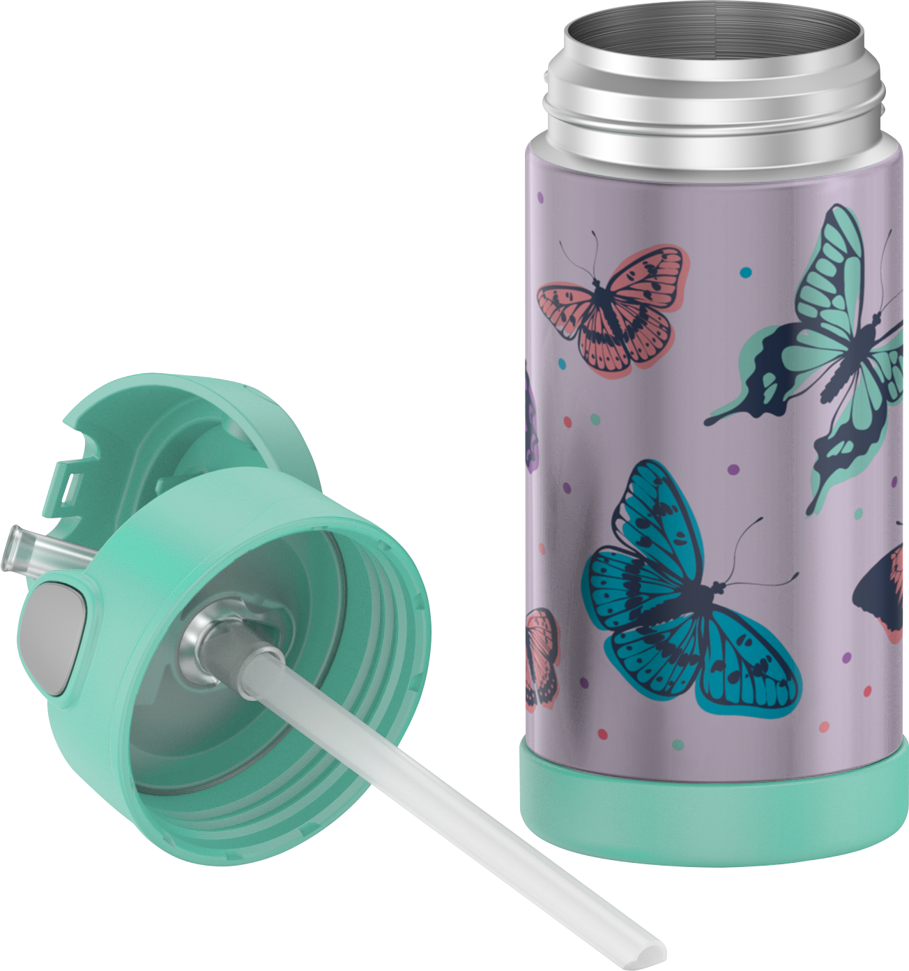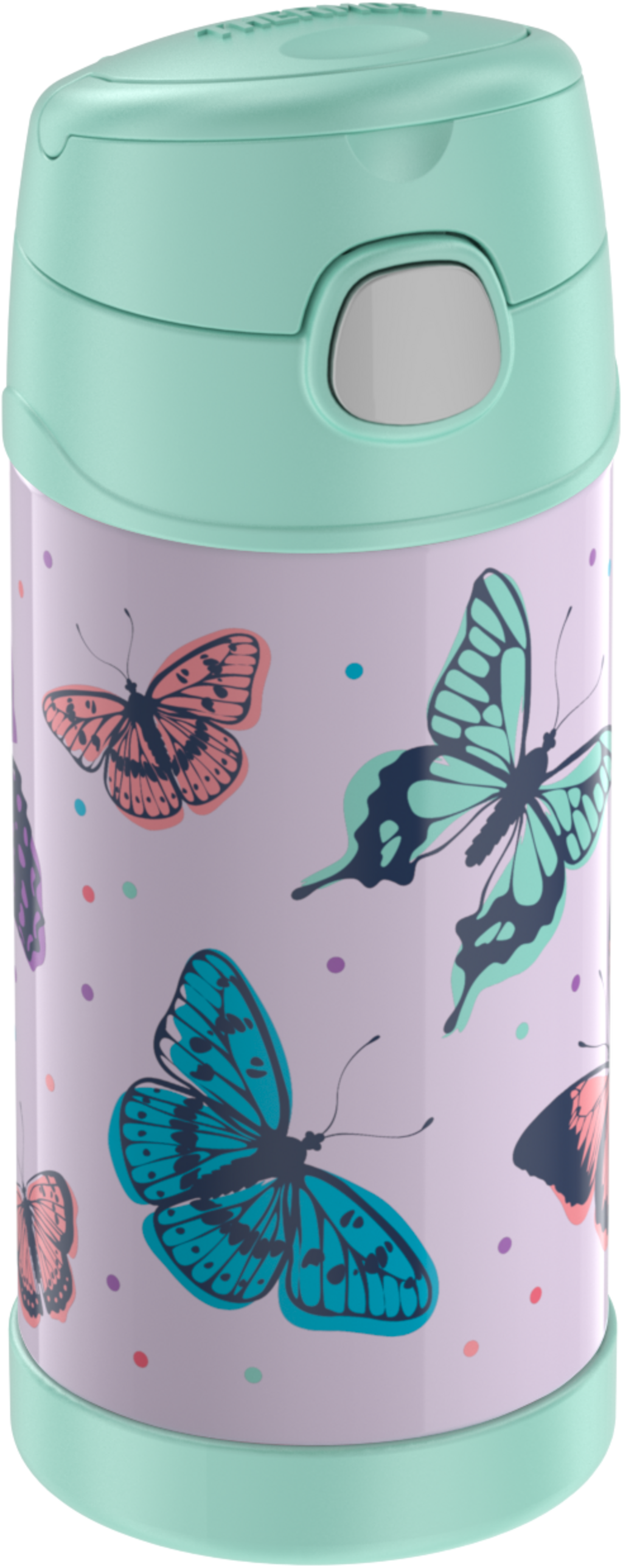 Perfect for little explorers! This insulated bottle has been specially designed for children's little hands and comes in cool designs and fun colours. Practical and clever details such as the silicone straw and the fold-out handle in the kid make the FUNTAINER drink bottle by Thermos the perfect accessory for everyday use.