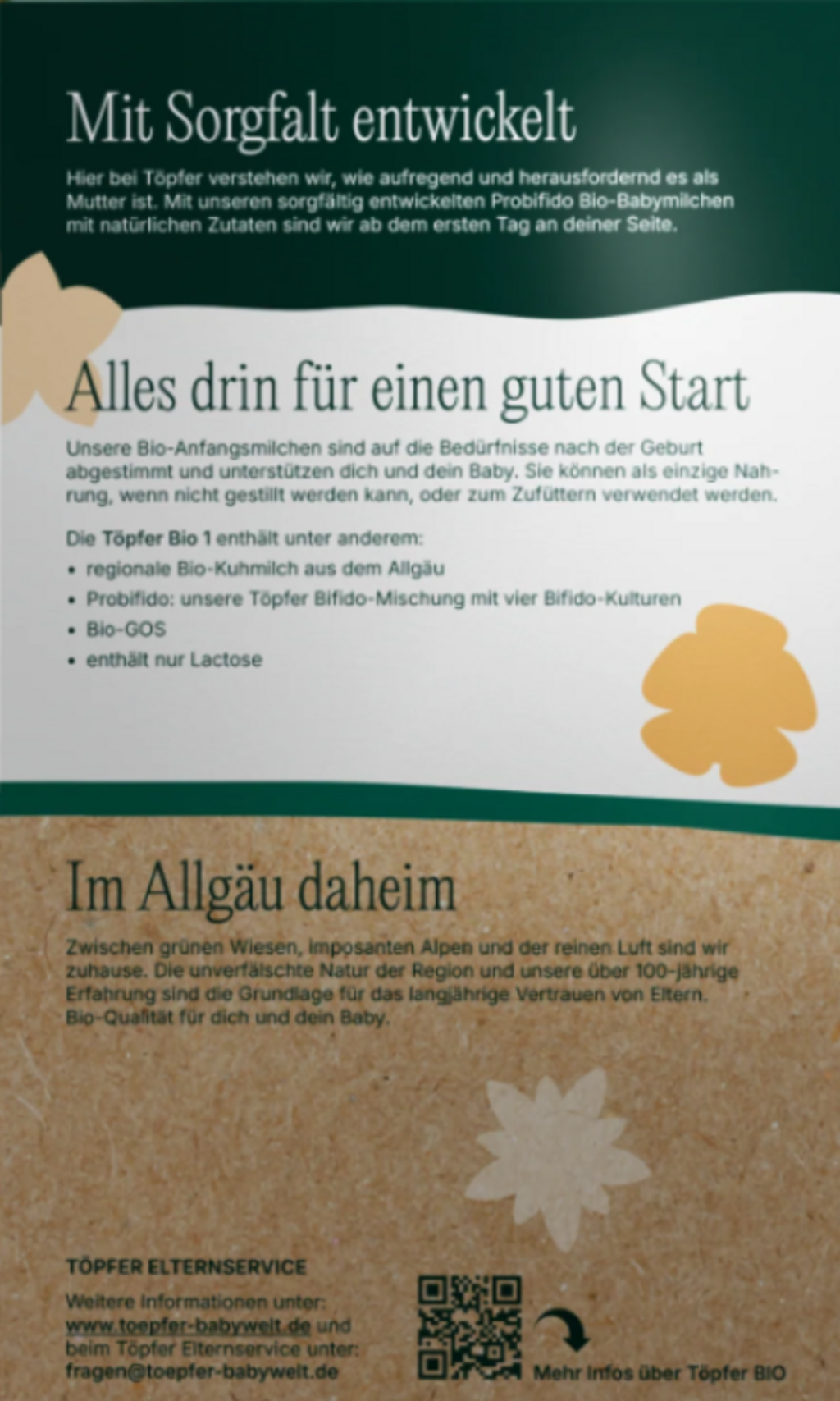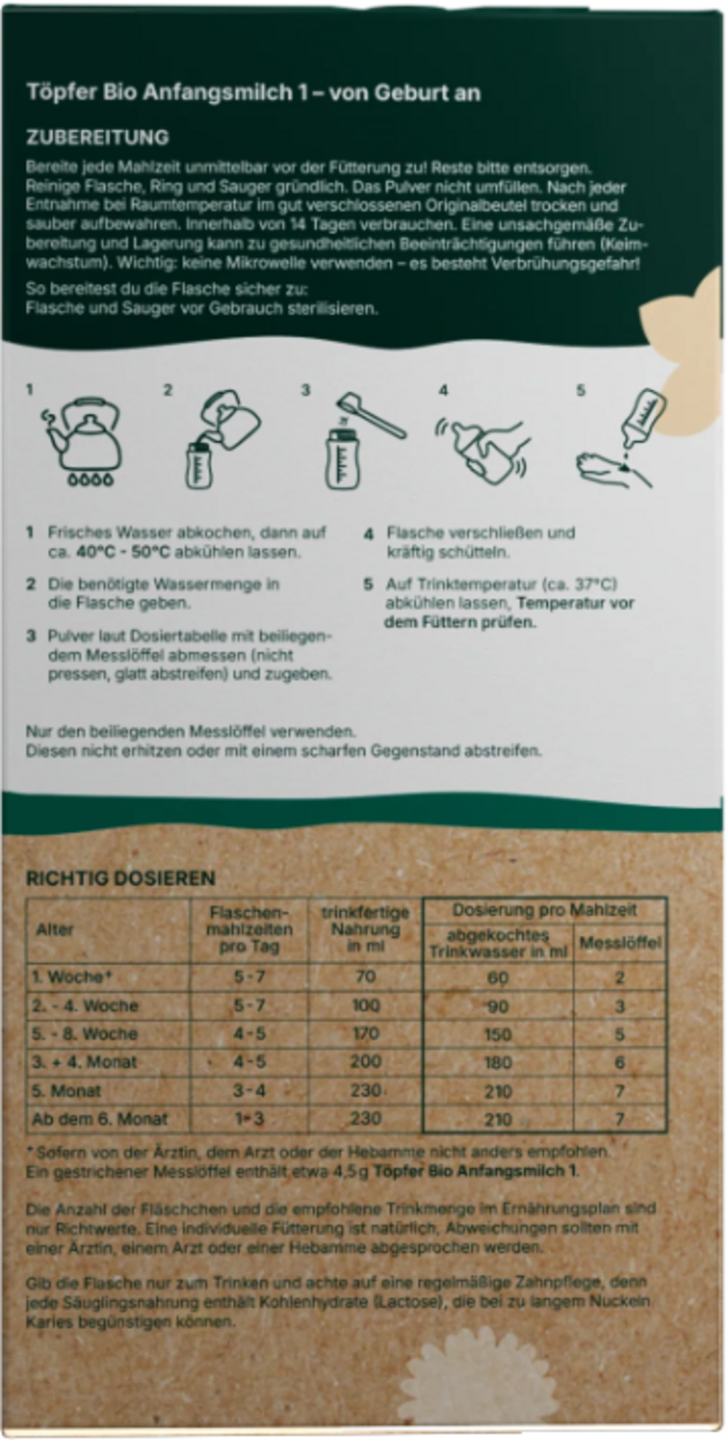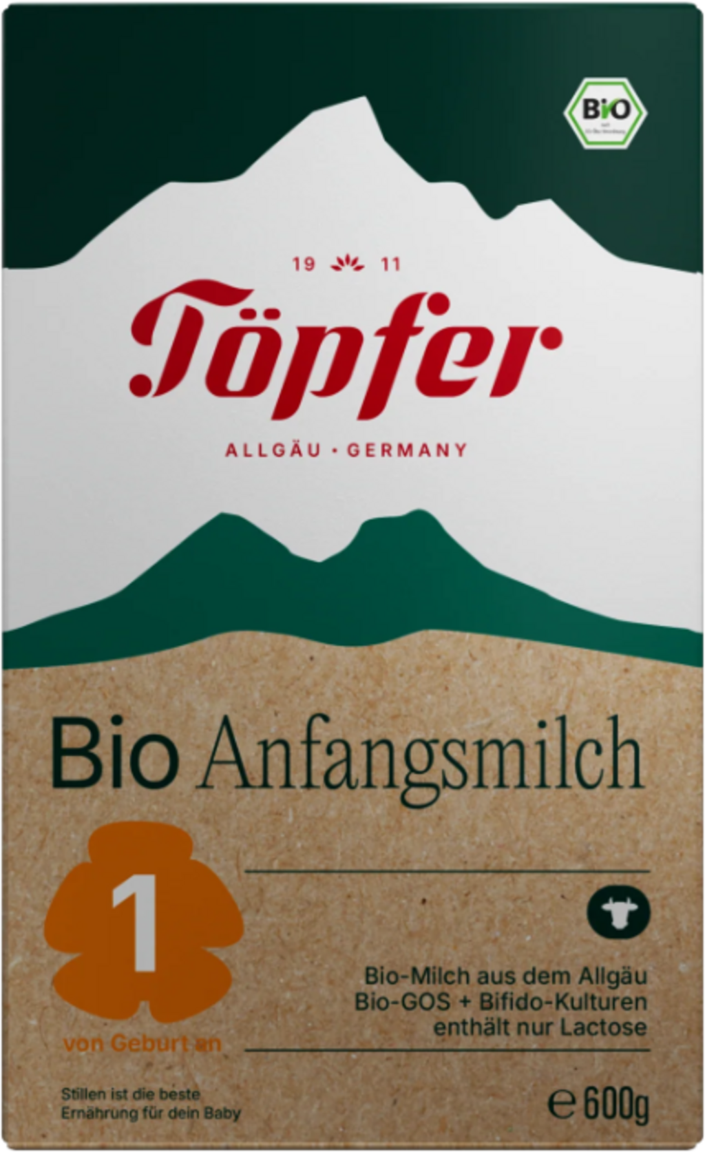 Töpfer's Organic Infant Formula Based on Cow's Milk 1 is based on high-quality organic milk from the Allgäu region and is specially formulated to suit the nutritional needs of newborn babies. It can be offered as a supplement to breast milk and can also be offered as the sole source of nutrition starting at birth and as long as the baby is bottle-fed.