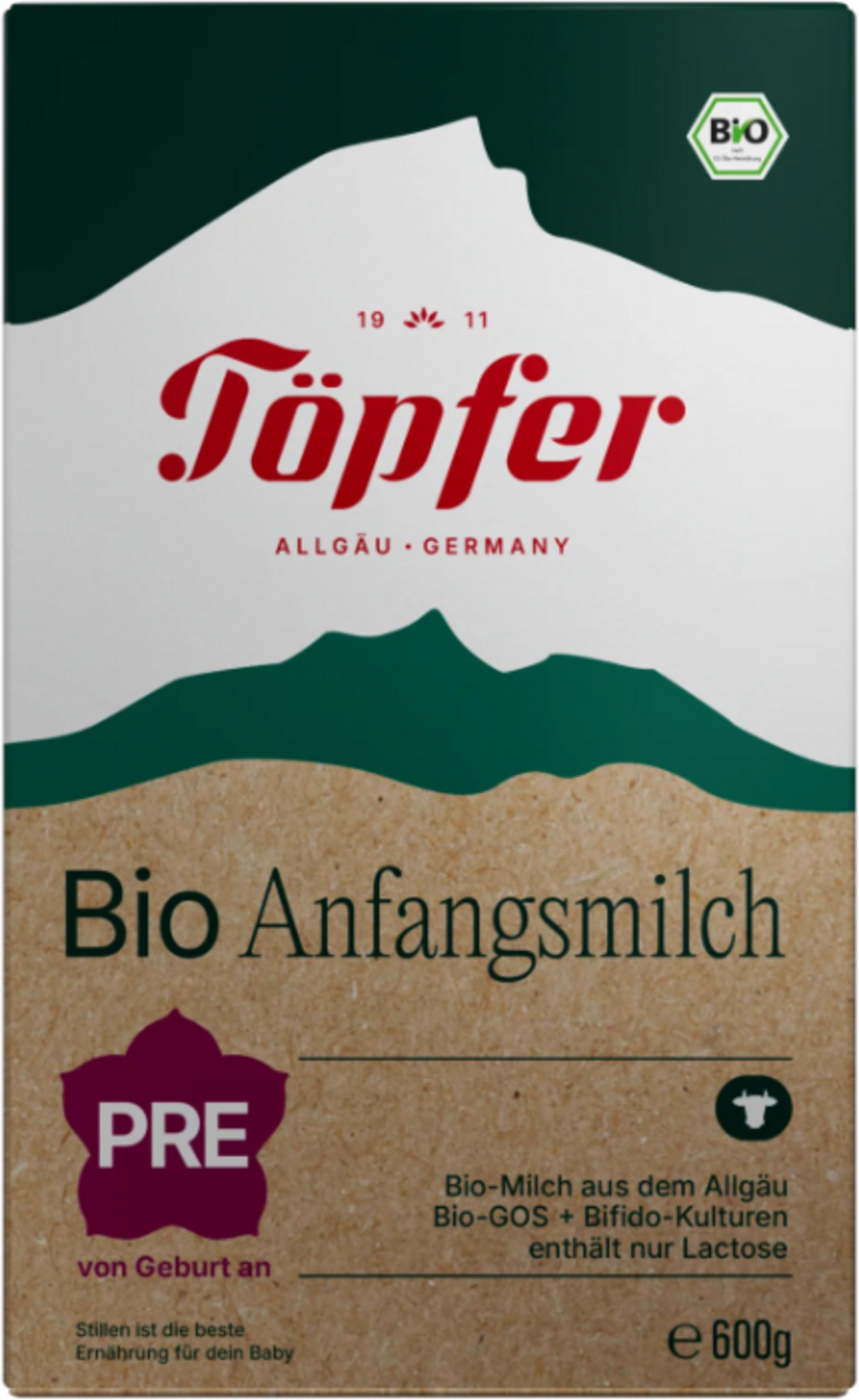 Organic Infant Formula Based on Cow's Milk PRE is made with organic milk from the Allgäu region and is specially formulated to meet the nutritional needs of newborn babies. It can be given as a supplement to breast milk or as the sole source of nutrition food starting at birth and for as long as the baby is bottle-fed.