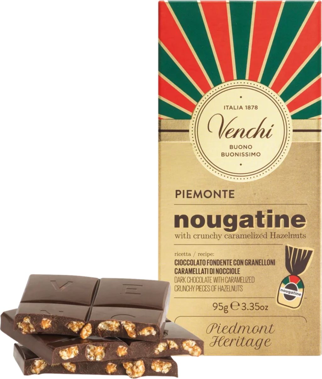 Nougatine pralines were created by Silviano Venchi in 1905. The pralines have been made according to a traditional recipe ever since. The best caramelised Piedmont hazelnuts are chopped and coated with dark chocolate in this bar.