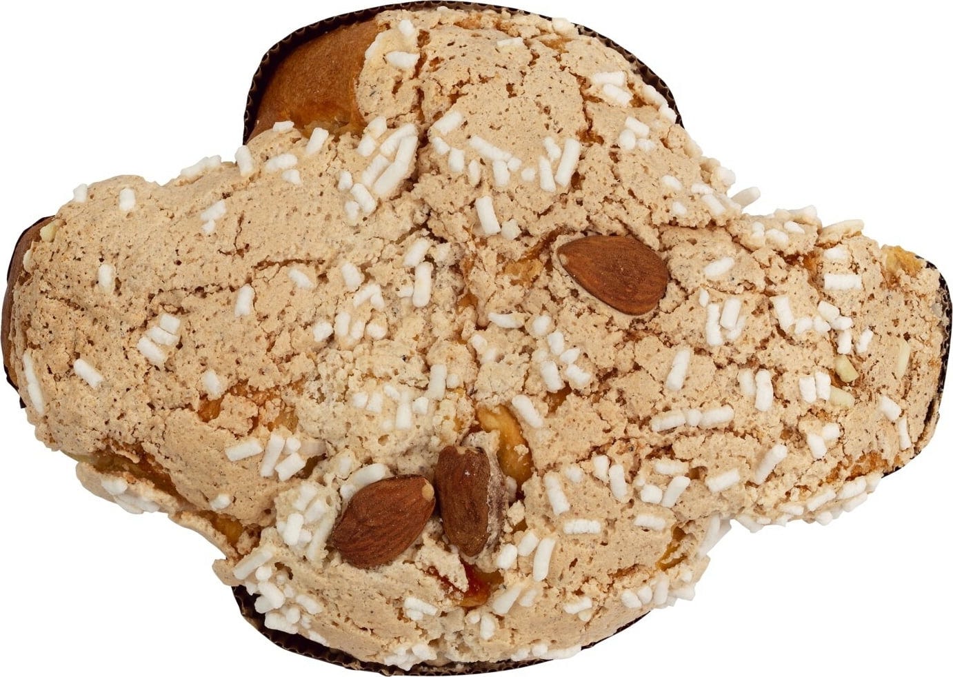 The fluffy yeast dough is refined with candied orange peels. Once baked, the cake is covered with a hazelnut glaze and whole almonds as tasty decorating elements.